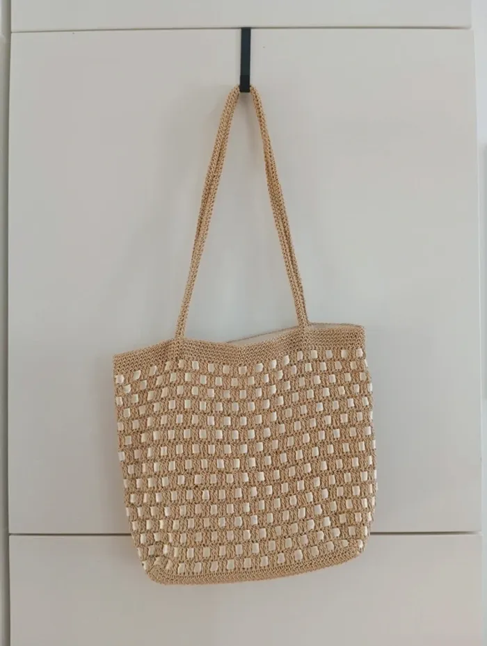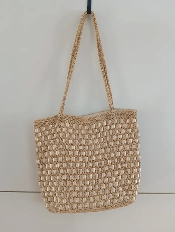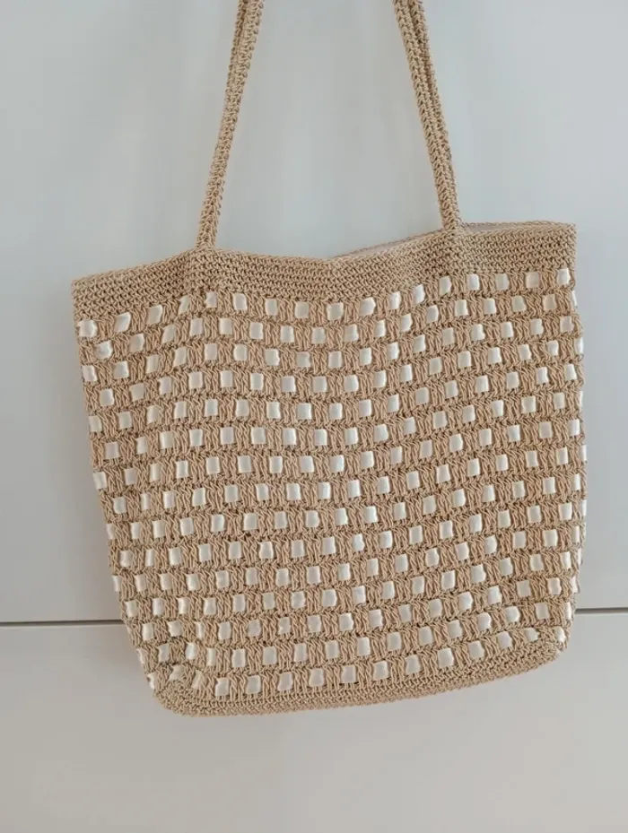 ✨ Sac cabas crocheté beige et écru ✨ Joli sac cabas fait main au style bohème, idéal pour l’été 🌞 Couleur : beige naturel avec détails écru Matière : crochet (fibre synthétique aspect raphia) + ruban tissu inséré Forme : cabas souple Anses longues, confortable à porter à l’épaule Dimensions approximatives : 32 (largeur) x 26 cm (hauteur, sans anses) Longueur anses 30cm Pièce rigide au fond pour structurer le sac État : très bon, peu porté