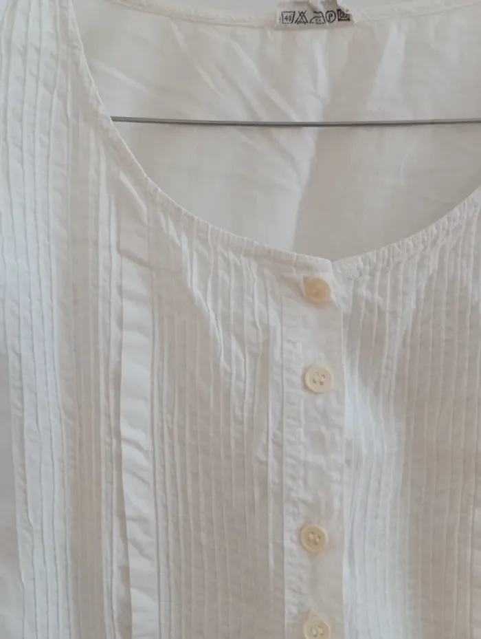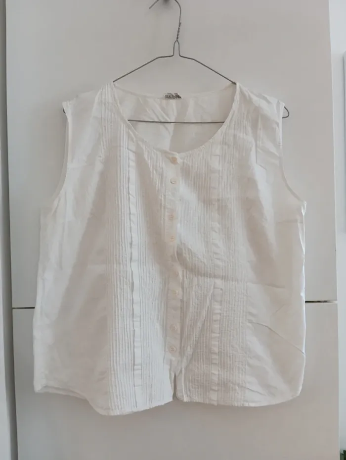 Blouse blanche vintage sans manches en coton Boutonnée et plissée à l'avant Taille estimée Mesures Epaules 39cm Aisselles 54cm Longueur 57cm