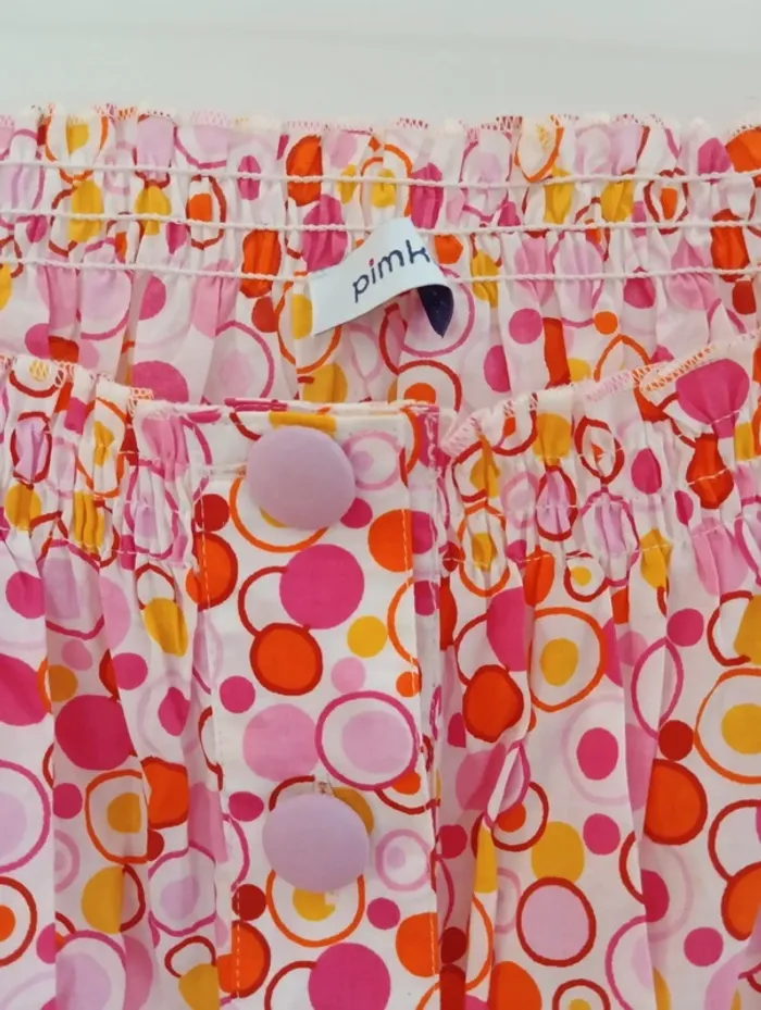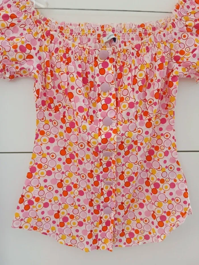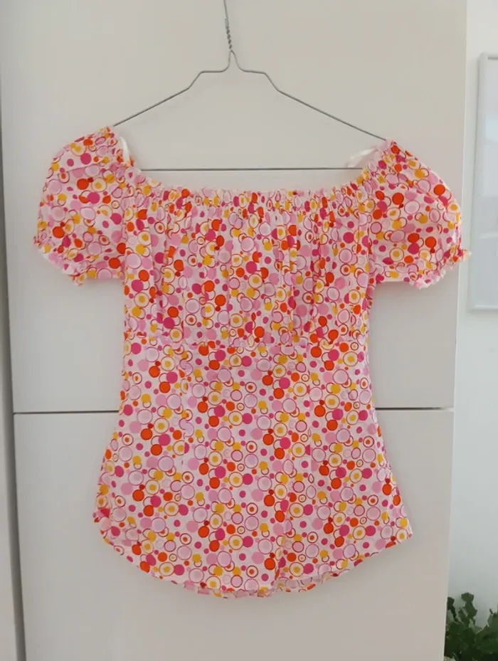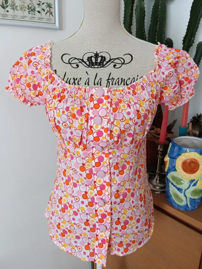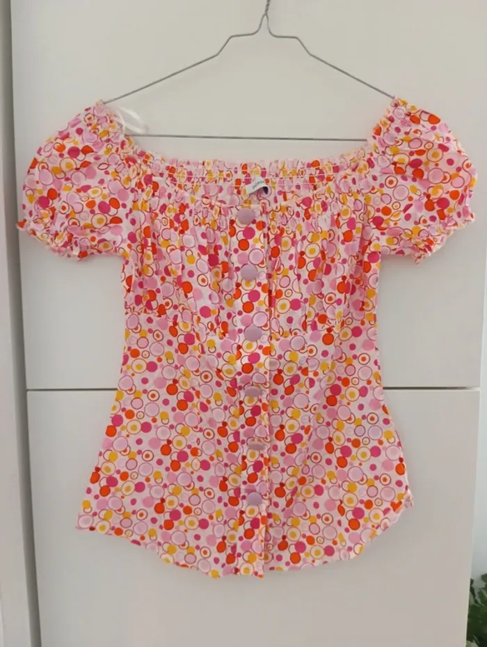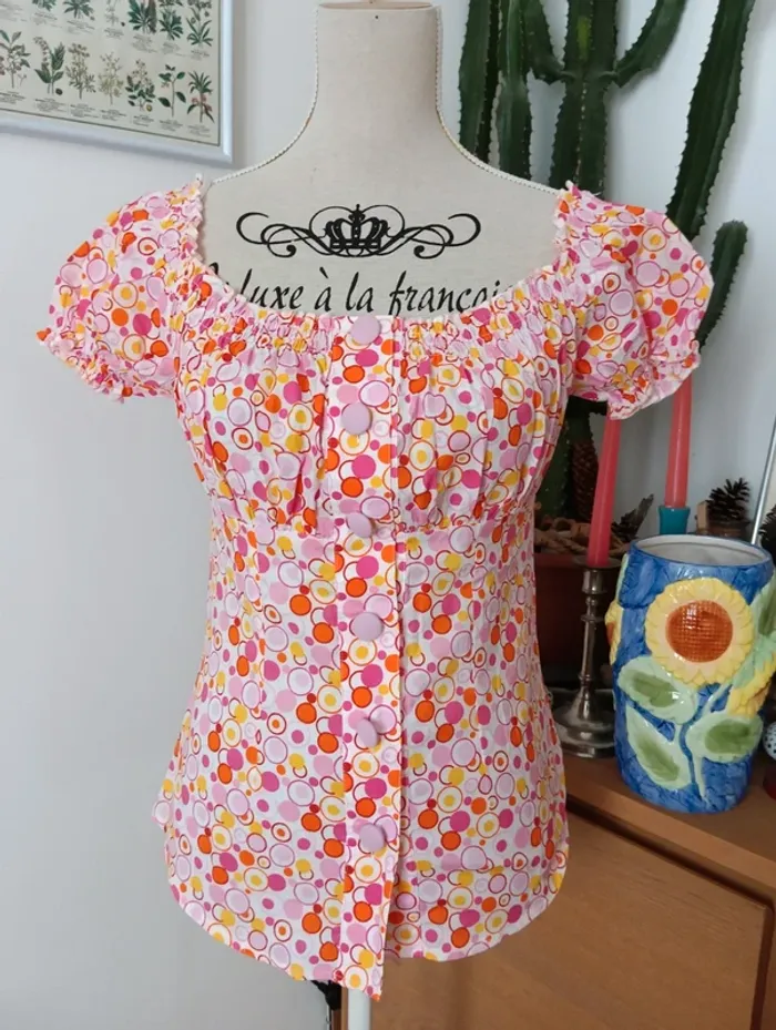 Blouse boutonnée légère vintage, imprimé psychédélique. Manches courtes Col et bout des manches élastique, décolleté style Bardot 100% coton Mesures Aisselles 45cm Longueur 55cm