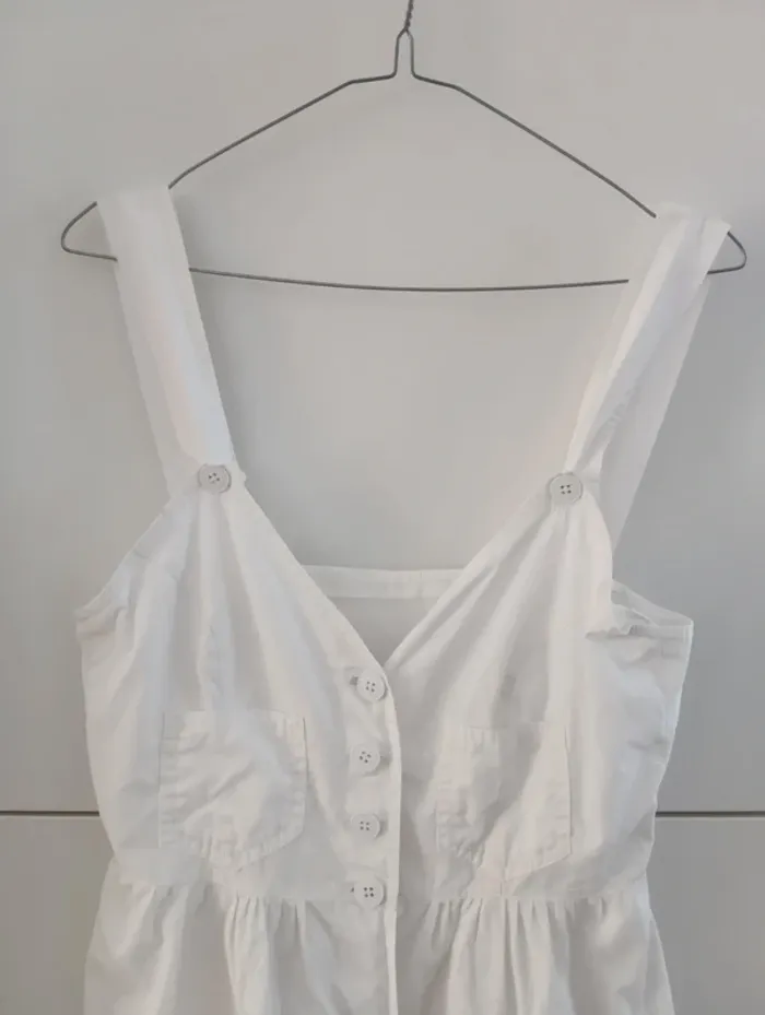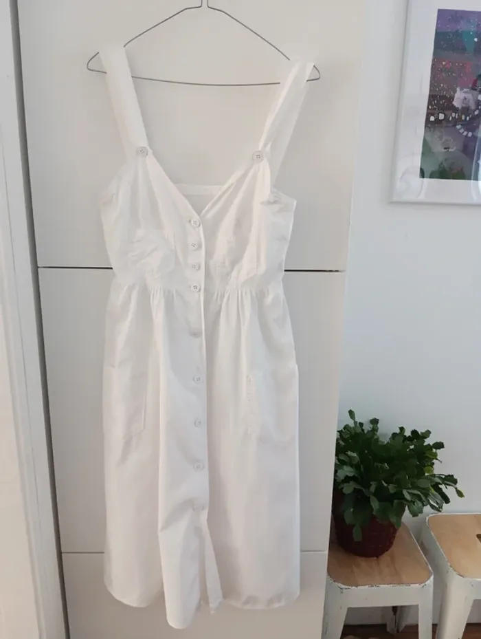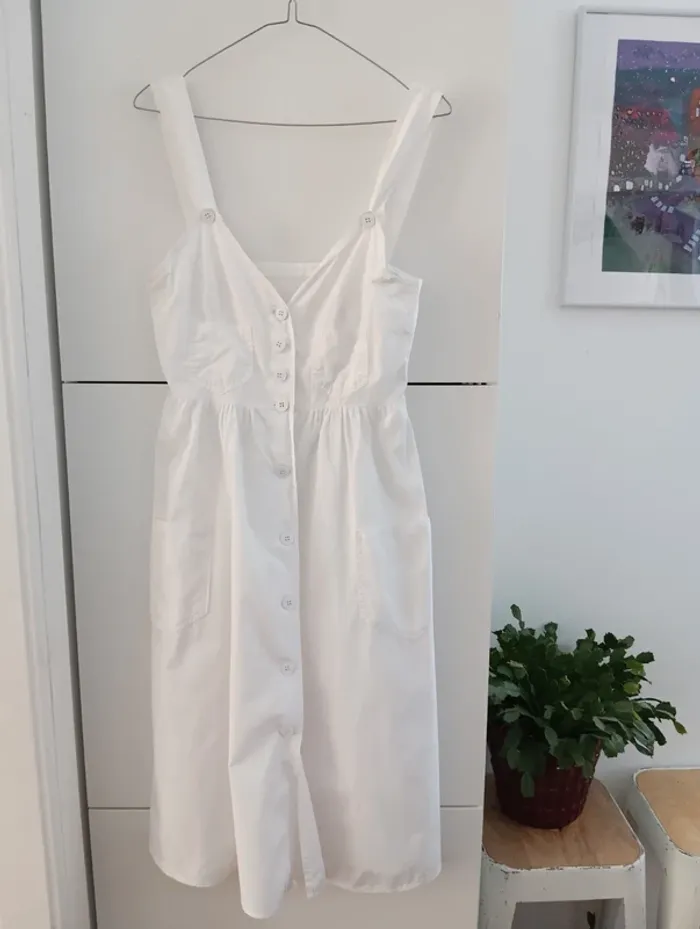 Robe blanche Boutonnée vintage coton Léger Deux poches plaquées à l'avant La surpiqûre des Bretelles se découd légèrement. Taille 36/38 estimée A confirmer avec les mesures Aisselles 40cm Taille 36cm Longueur 108cm Très légère trace rose à la base de la bretelle droite. réparation d'un petit trou à l'aisselle droite