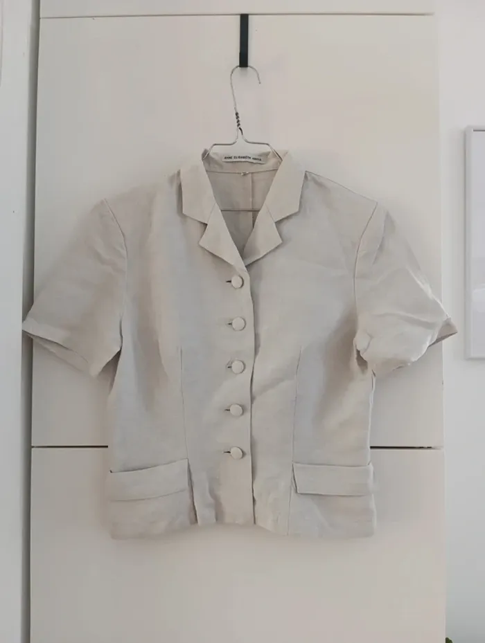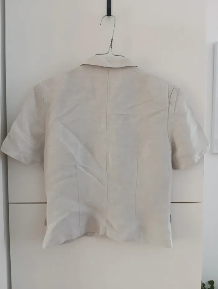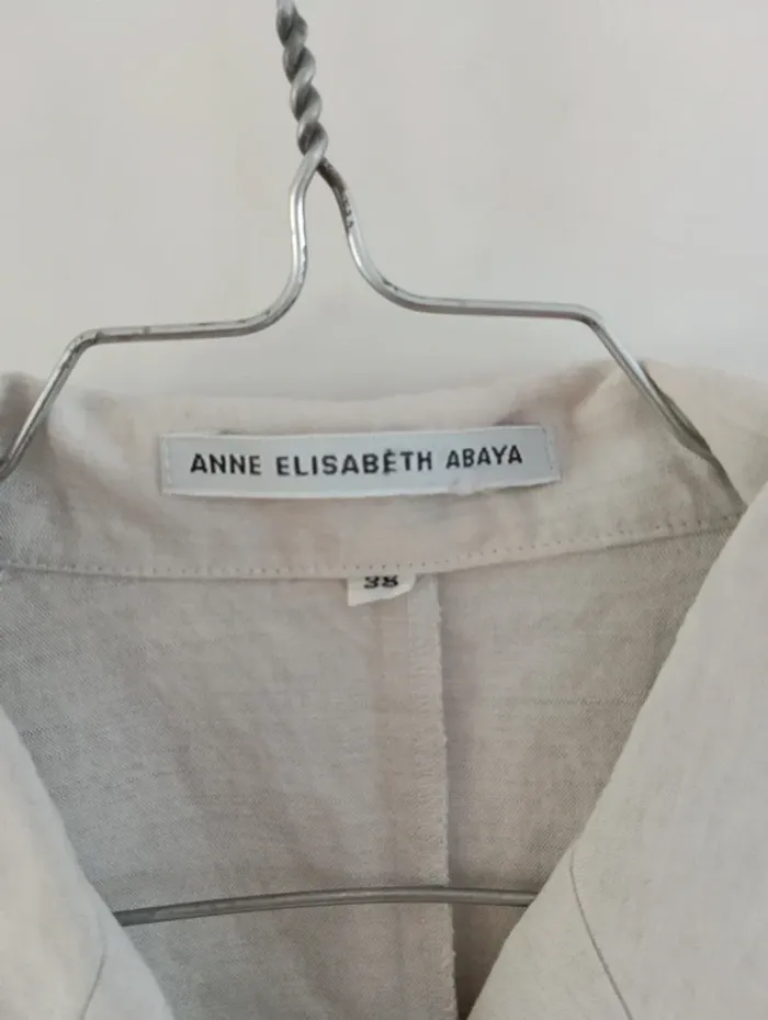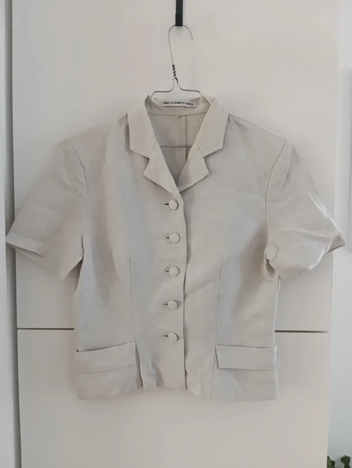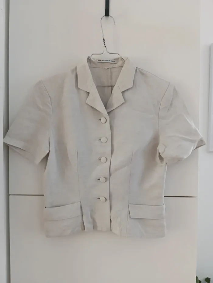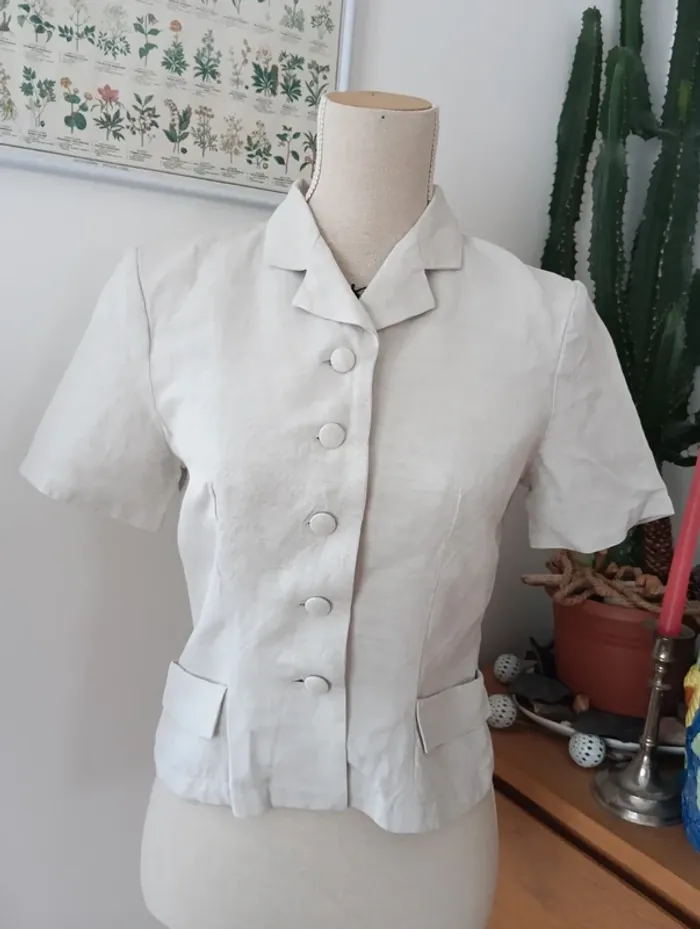 Veste vintage lin manches courtes Anne Elisabeth Abaya Made in France 51% lin 49% viscose Taille 38 indiquée 36 estimée A confirmer avec les mesures Epaules 39cm Aisselles 44cm Longueur 49cm