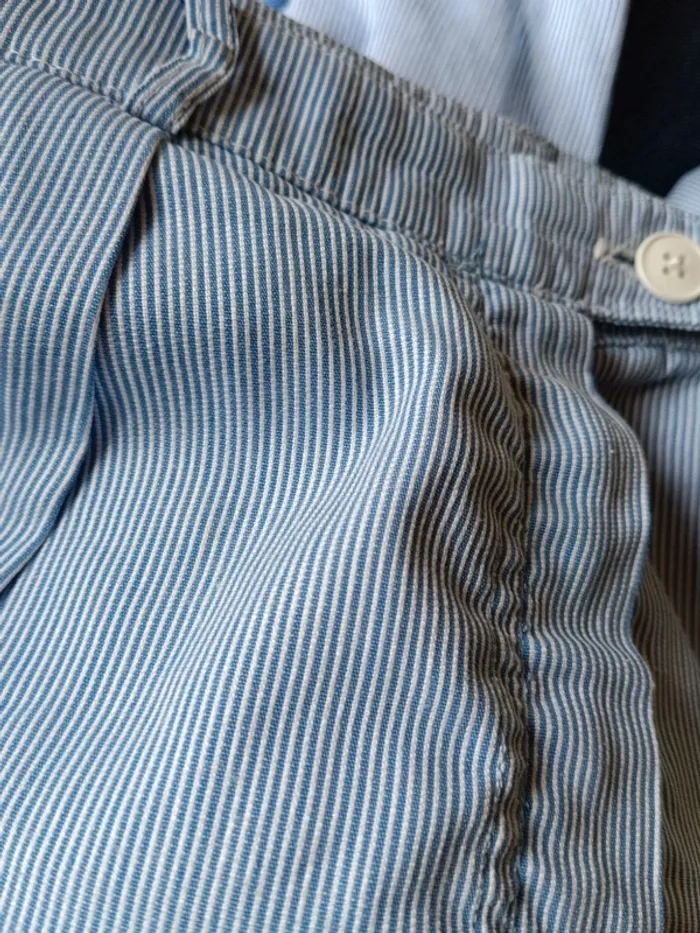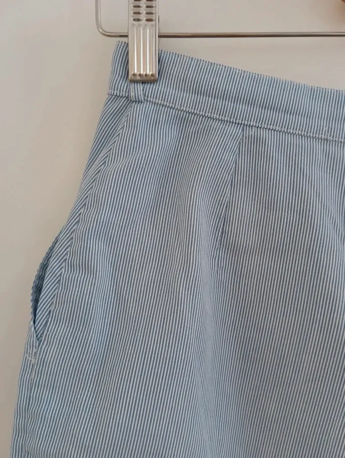 Bermuda vintage à fibres rayures bleues un et blanches Miss Helen Revers au bas des jambes. 62% coton 38% polyester Fermeture éclair+ 1 bouton Taille 38 estimée à confirmer avec les mesures Taille 36cm De la taille à l'entrejambe 29cm Longueur 54cm Les coutures sont usées à l'entrejambe mais elles tiennent très bien.( dernière photo)