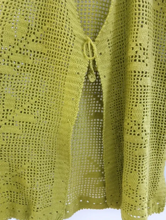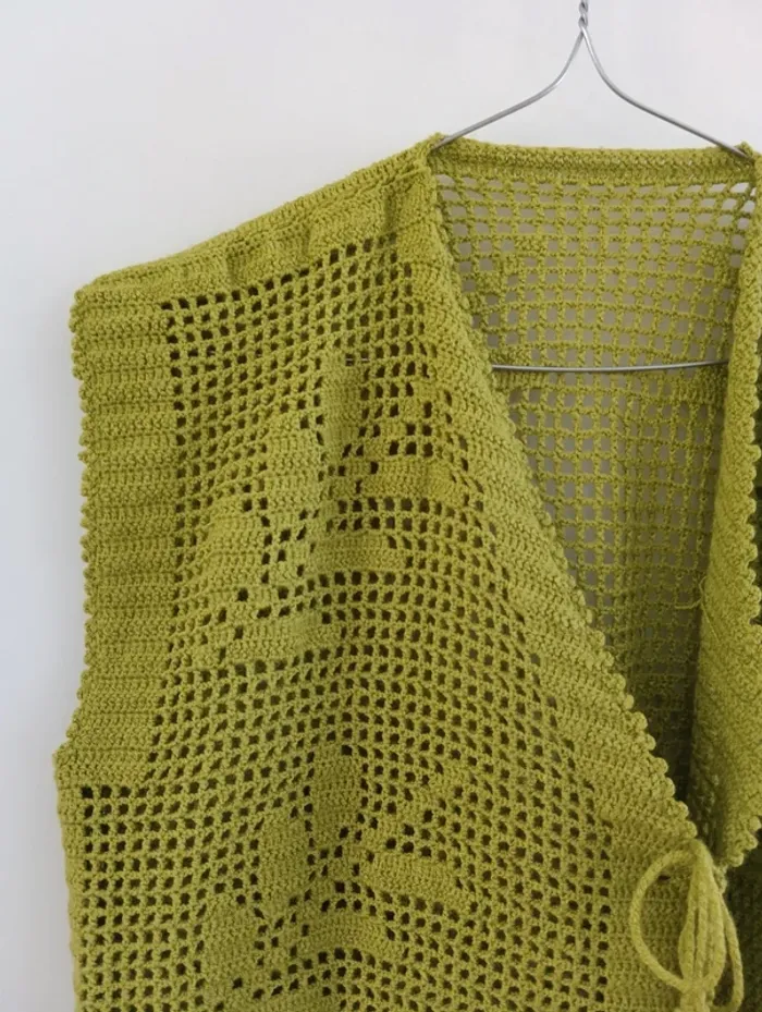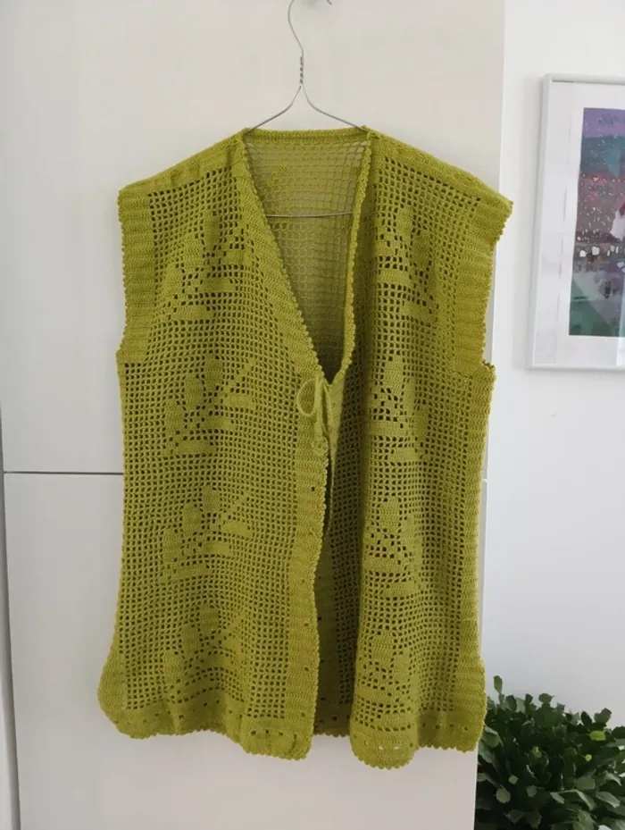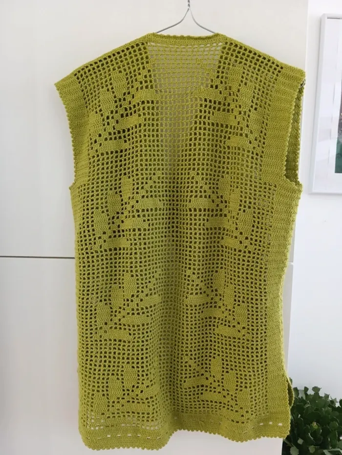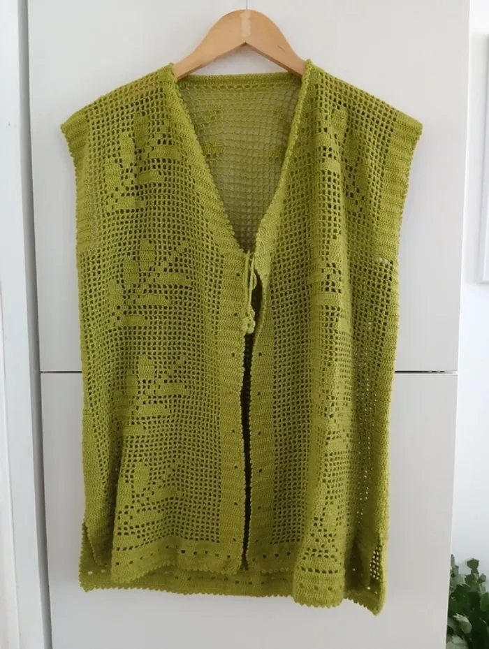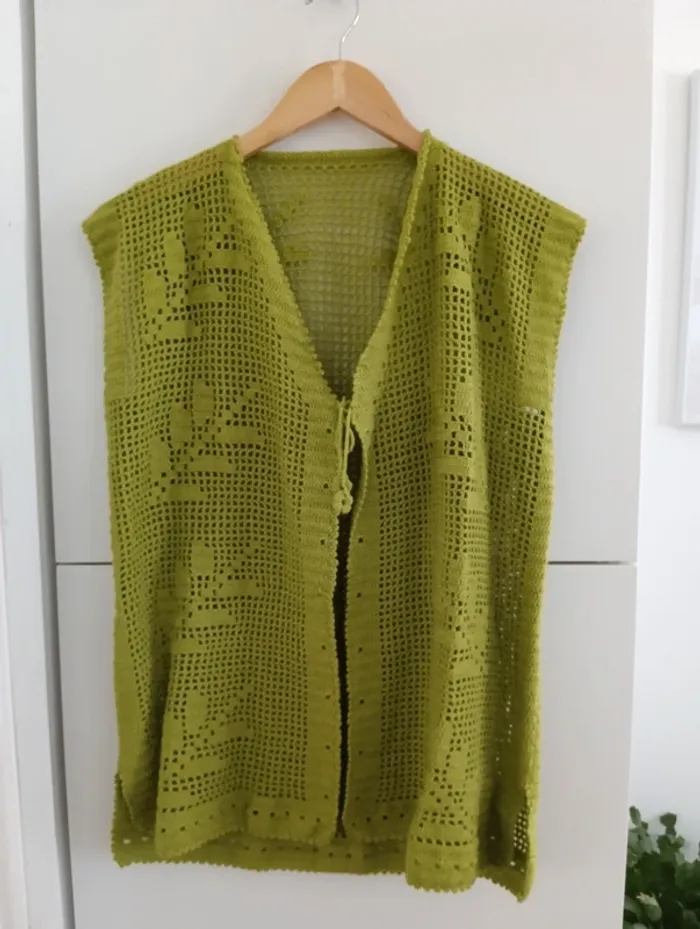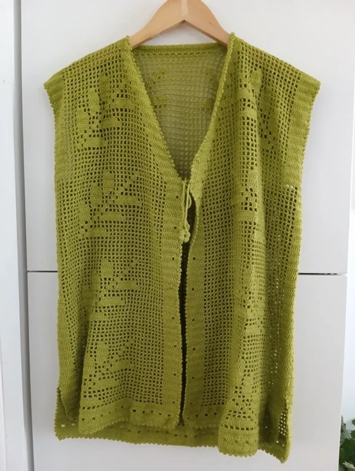 Gilet sans manches en coton ajouré Crocheté, motifs feuilles , fendu sur les côtés. Handmade , Vert olive Taille 40 /42 estimée à confirmer avec les mesures Mesures Epaules 46cm Aisselles 52cm Longueur 69cm Pas d'indication de matière, peut être du coton