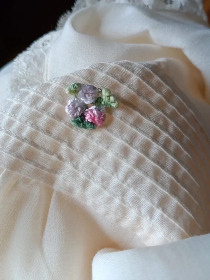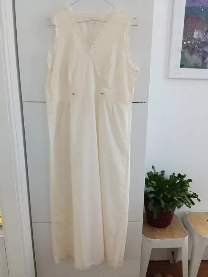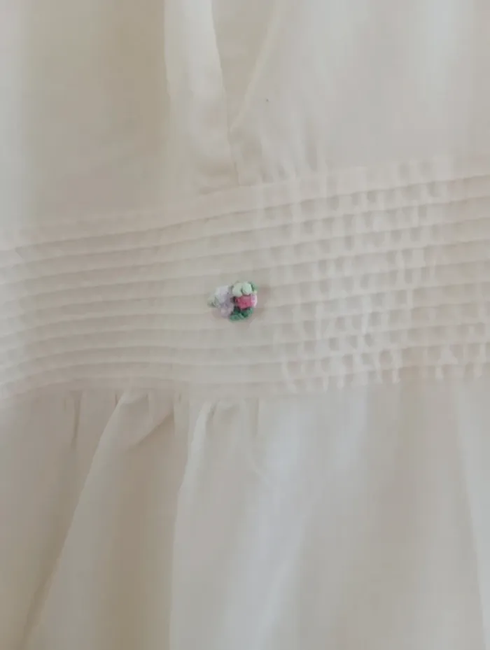 Chemise de nuit vintage écrue lingelor Bordure dentelle Deux petites appliques fleurs multicolores en tissu faisant l'effet de boutons multicolores. Taille 40 estimée à confirmer avec les mesures selon l'effet souhaité. Mesures Epaules 36cm Aisselles 50cm Longueur 123cm