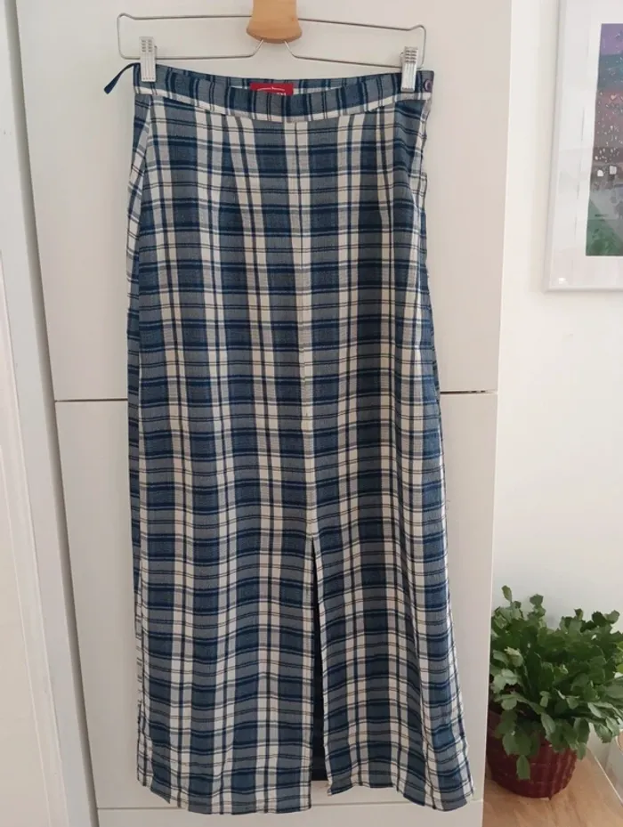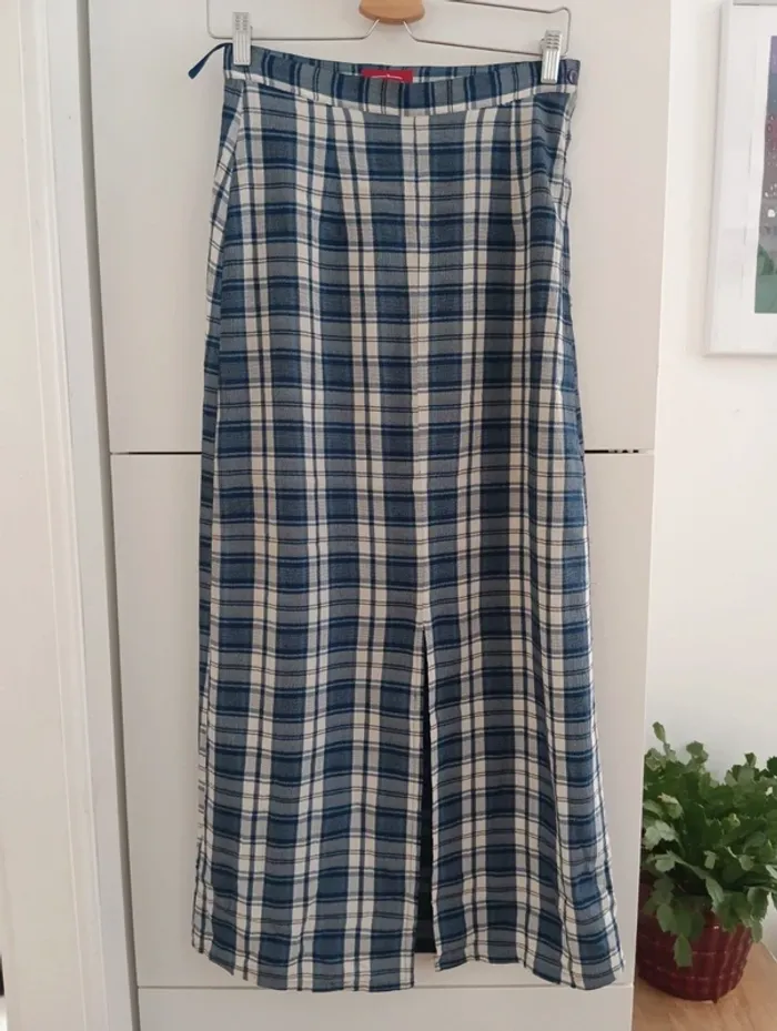 Jupe longue à carreaux vintage taille 34/36 Fendue à l'avant Viscose et polyester Coupe droite Mesures Taille 34cm Longueur 100cm Le dessus de la fente a été réparé.