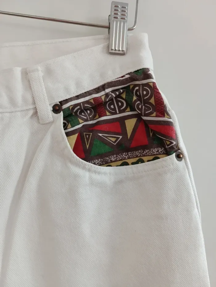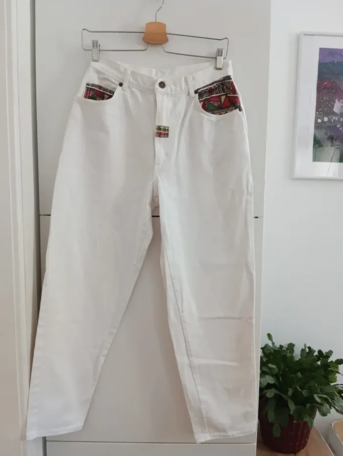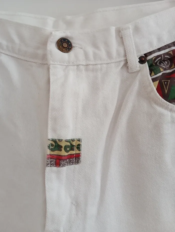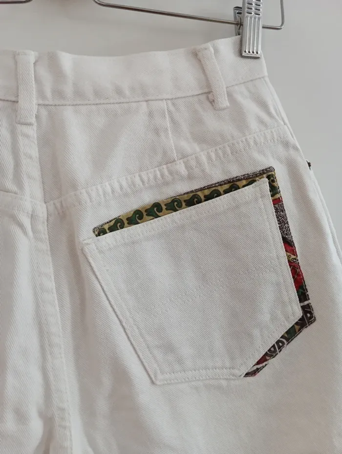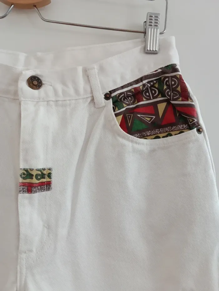 Jean blanc vintage taille haute Empiècements ethniquesnau niveau des poches Mesures Taille 36cm De la taille à l'entrejambe 29cm Longueur 95cm