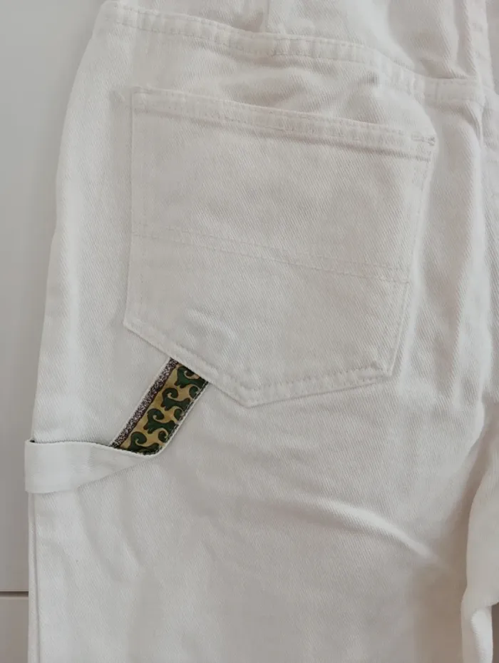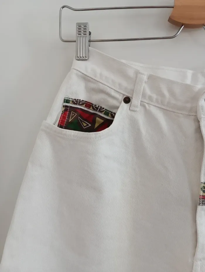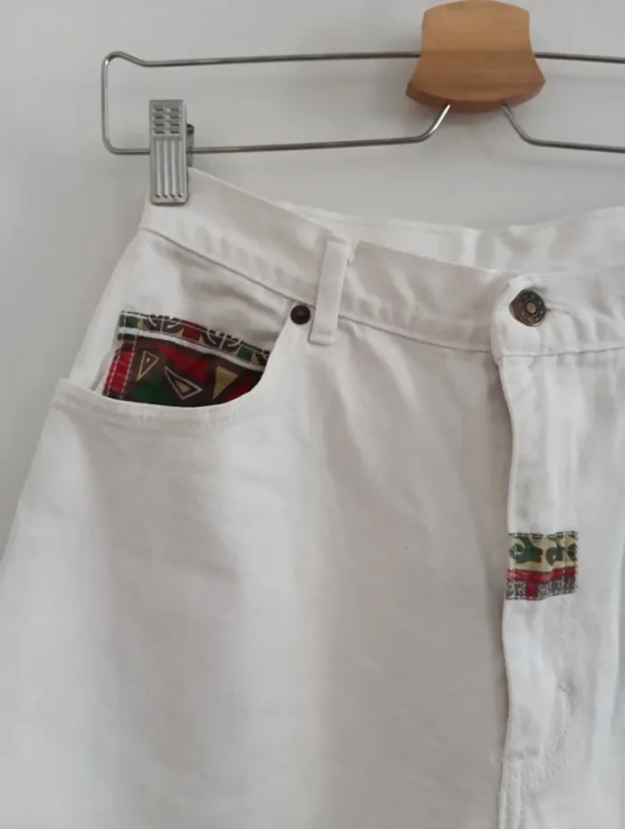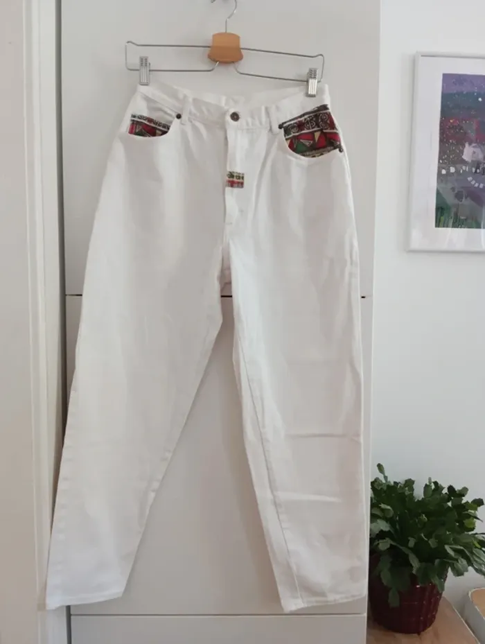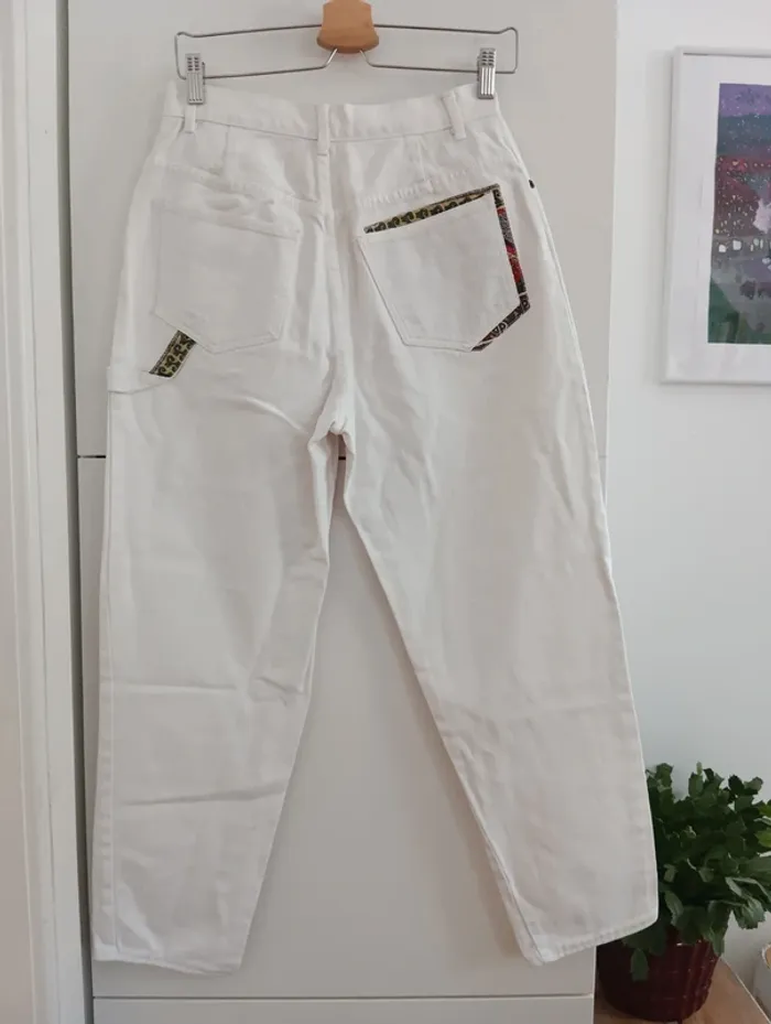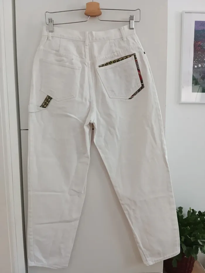 Jean blanc vintage taille haute Empiècements ethniquesnau niveau des poches Mesures Taille 36cm De la taille à l'entrejambe 29cm Longueur 95cm