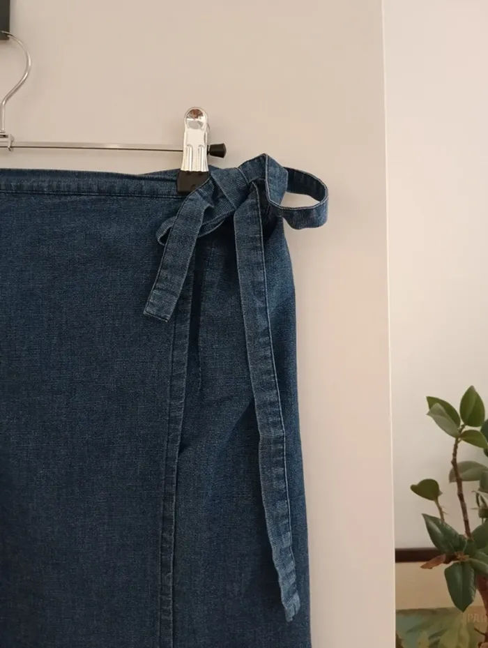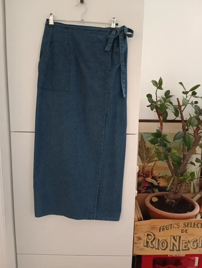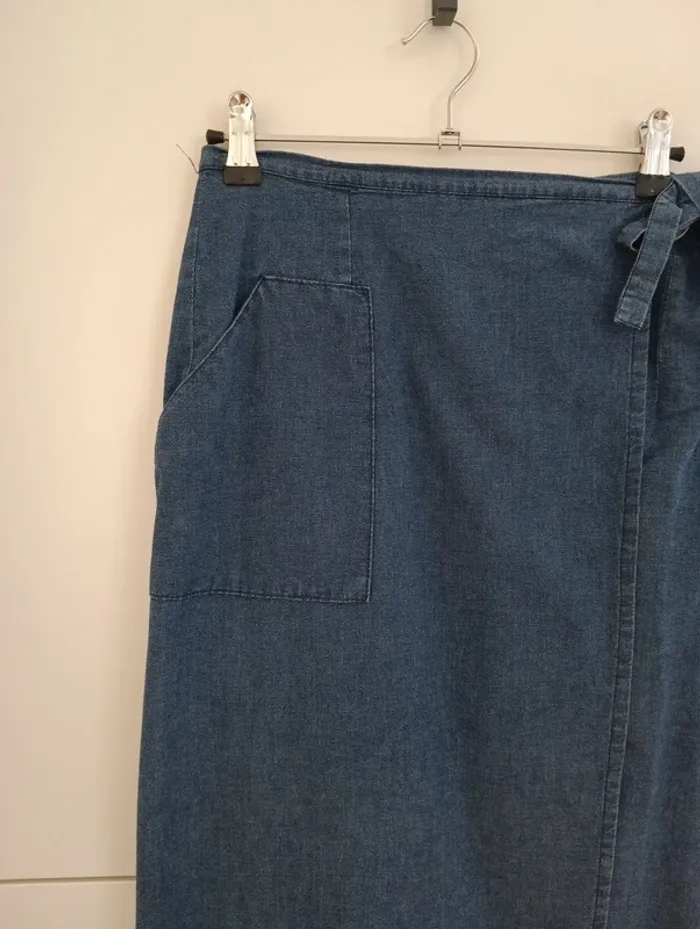 Jupe portefeuille Etam vintage Fabriquée en France. souple couleur jean poche sur le côté. Taille 36 estimée, modifiable en déplaçant le petit bouton de l'intérieur. mesures taille 33cm longueur 88cm