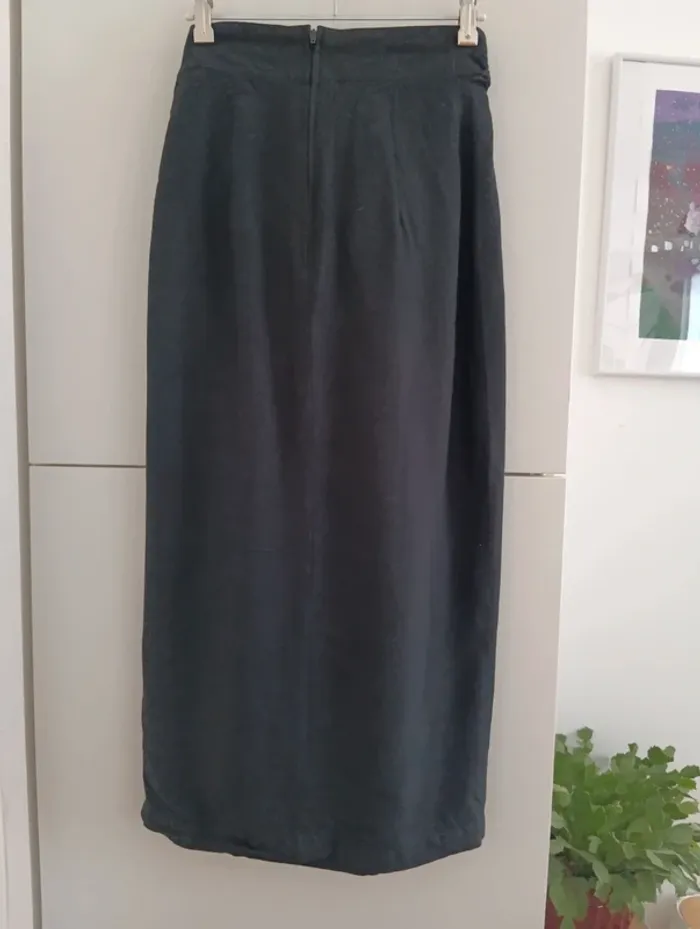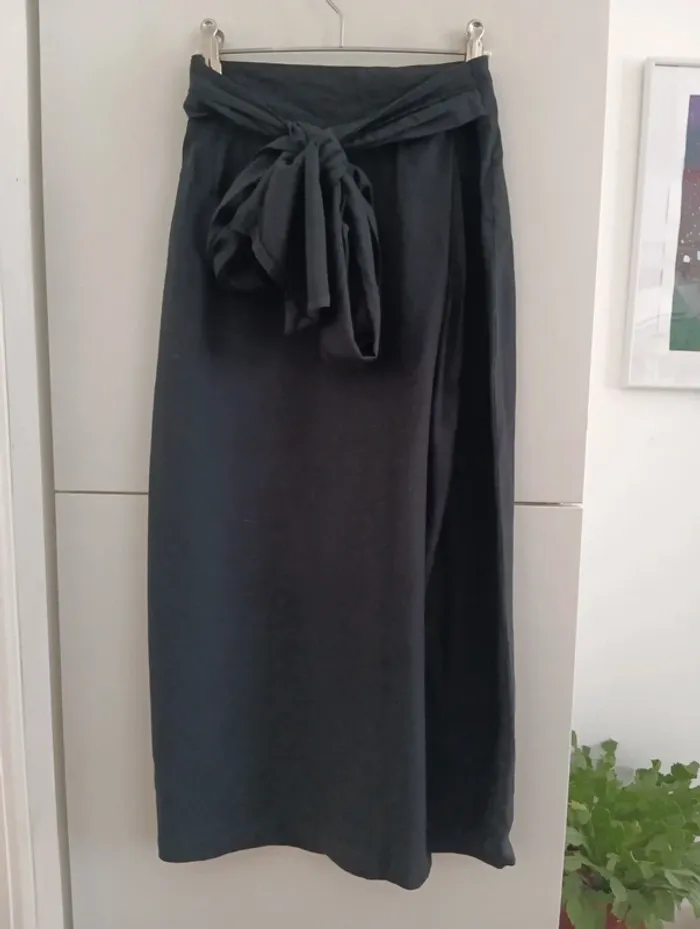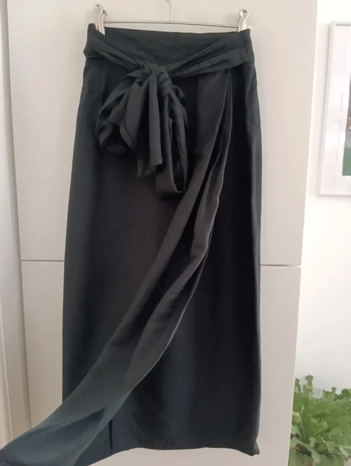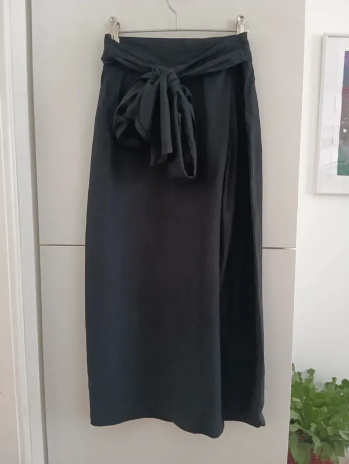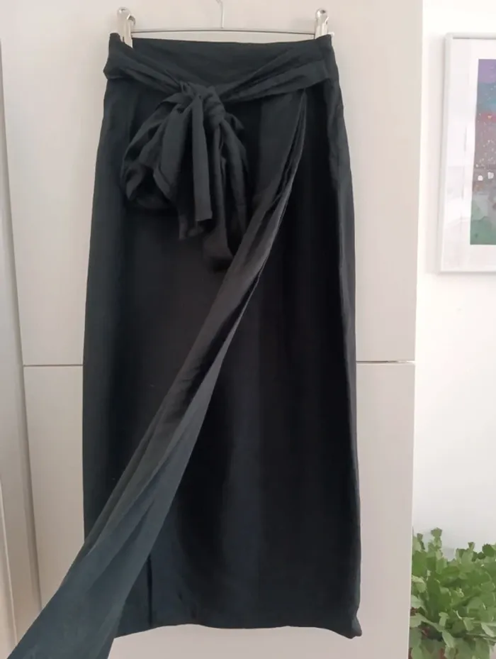 Jupe vintage noire droite effet drapé à nouer Pas d'indication de matière mais le tissu est sans doute un mélange lin/ viscose Alba moda Mesures Taille 36cm Longueur 90cm Deux petits accros à la taille mais ne se voient pas car masqués par la ceinture à nouer de la robe.