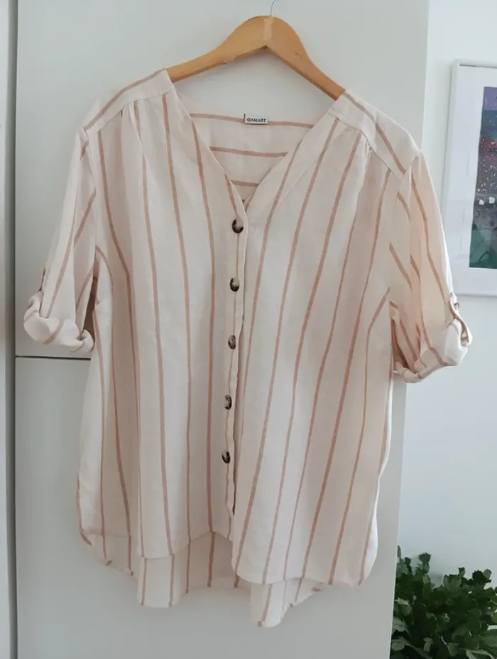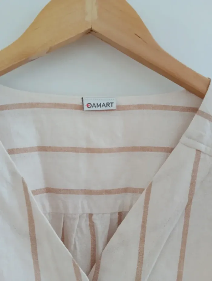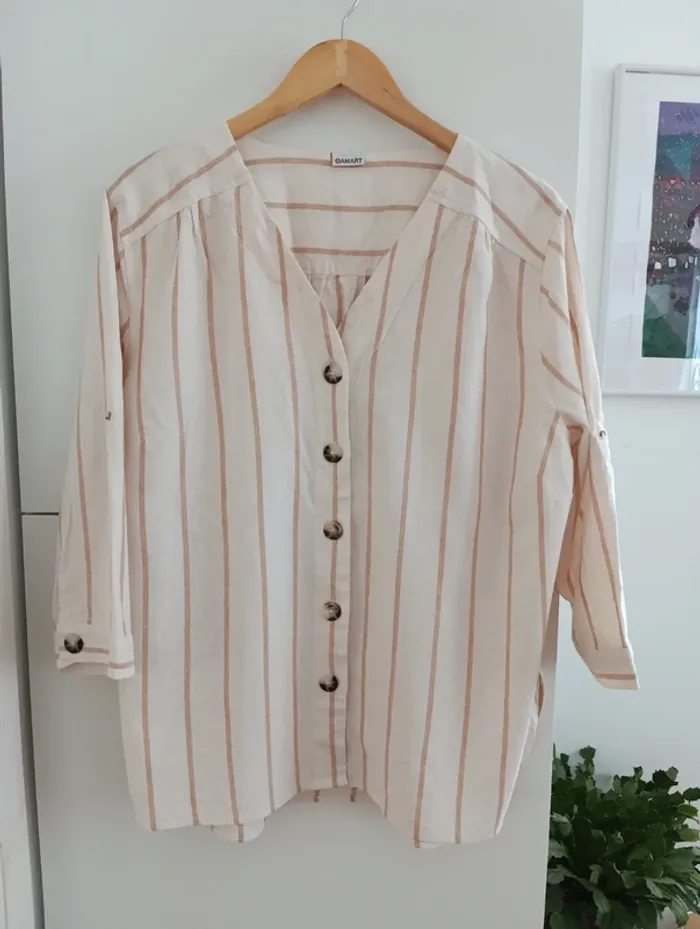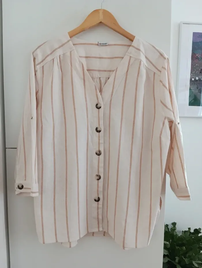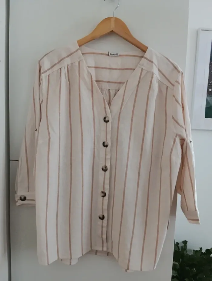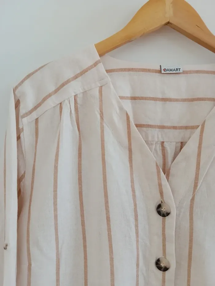 Blouse chemise a rayures beige/écru taille 50 De la marque Damart, Les manches peuvent se roulotter et s'attacher avec une pate de boutonnage Taille 50 à confirmer avec les mesures selon l'effet souhaité Mesures Epaules 49cm Aisselles 65cm Longueur 71cm
