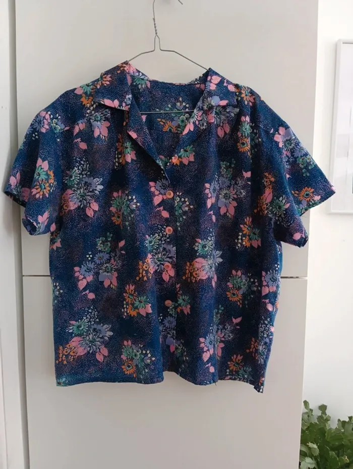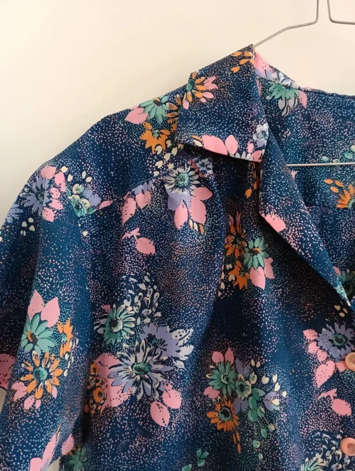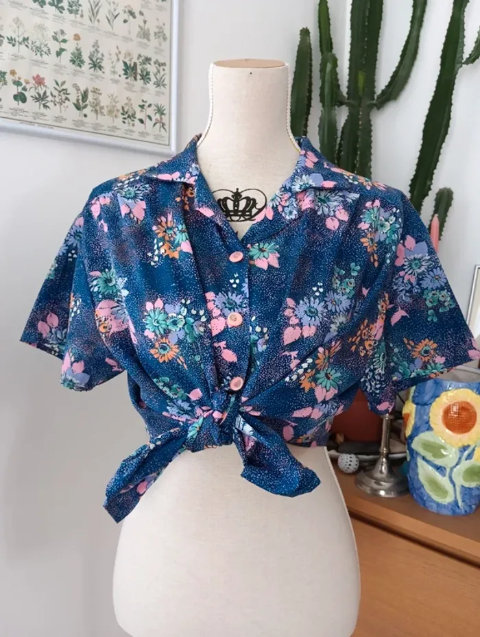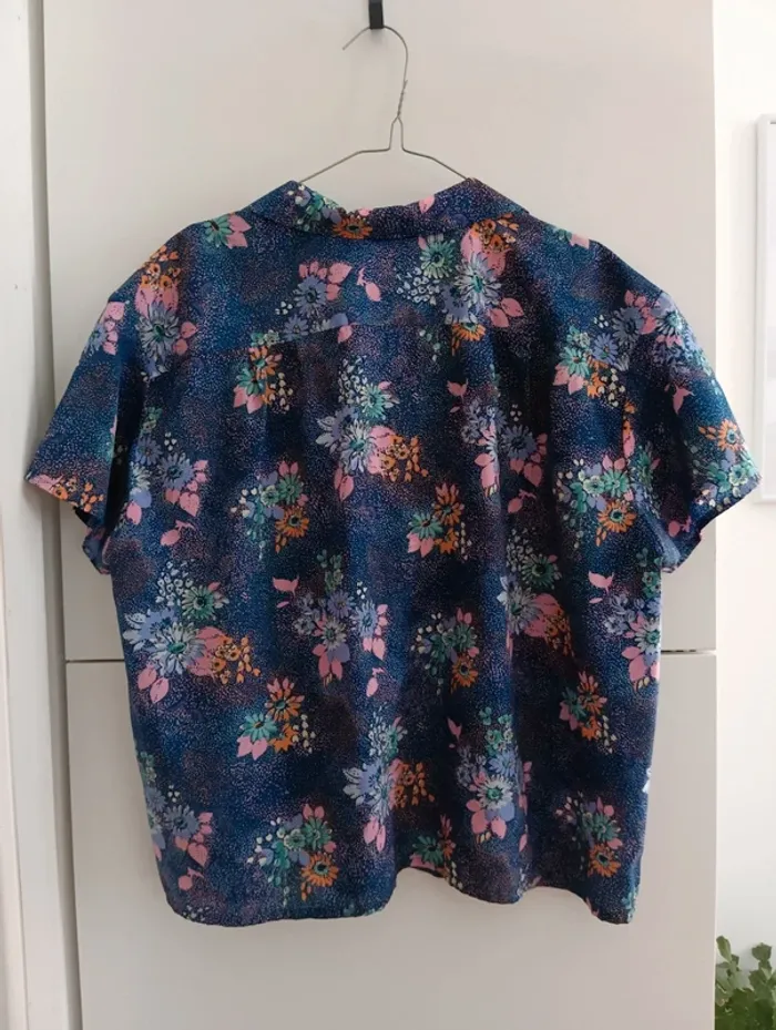 Chemise vintage manches courte Handmade Matière fluide Fleurs multicolores Taille 44 estimée à confirmer avec les mesures Mesures Epaules 50cm Aisselles 62cm Longueur 59cm