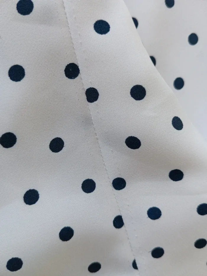 Veste vintage manches courtes Blanche à pois noirs Taille 40/42 estimée à confirmer avec les mesures Mesures Epaules 44cm Aisselles 54cm Longueur 72cm Aucune étiquette, en polyester Des coutures ont été défaites au niveau des pinces, cela a laissé quelques petitesmarques ( voir dernière photo)