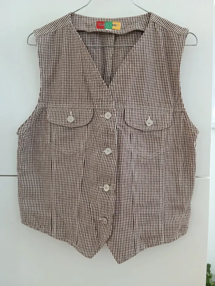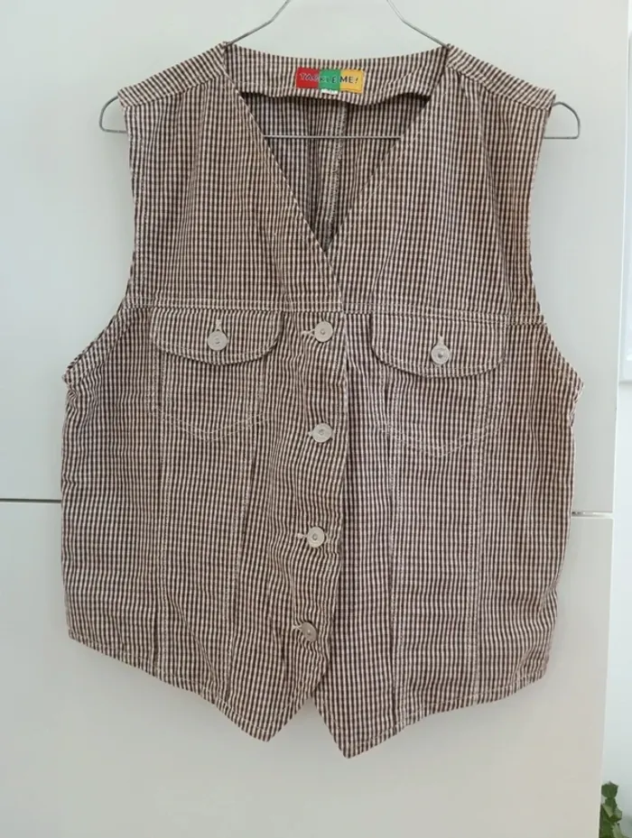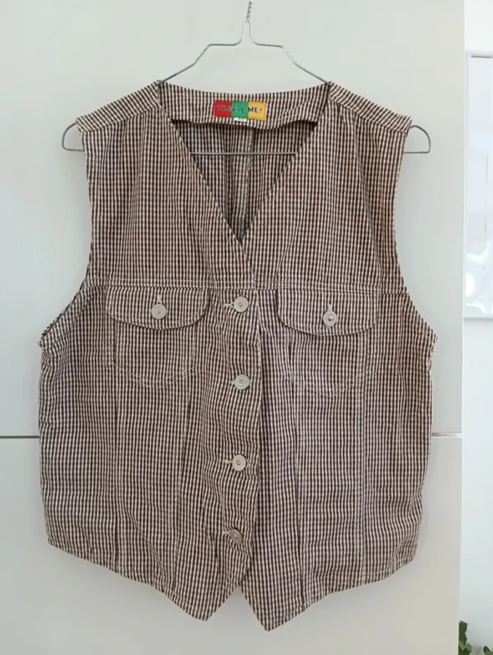 Veste vintage sans manches vichy marron/blanc - photo numéro 1