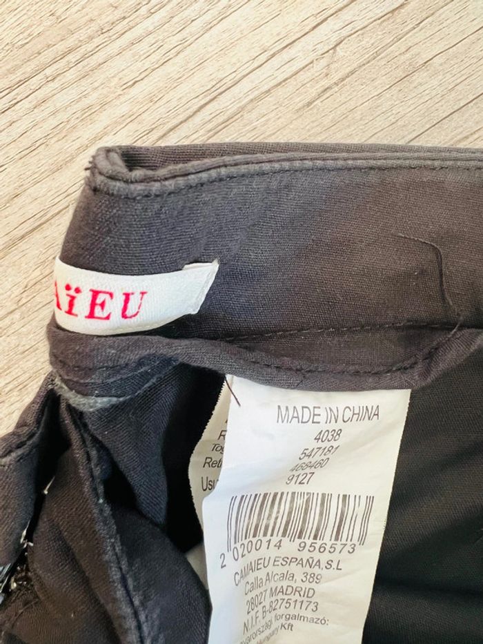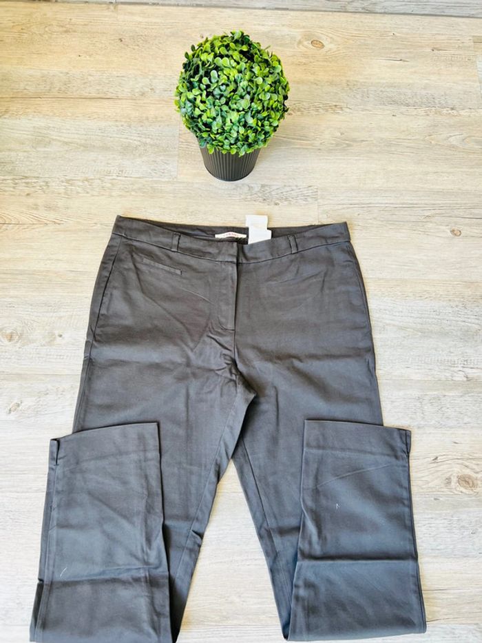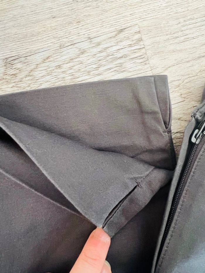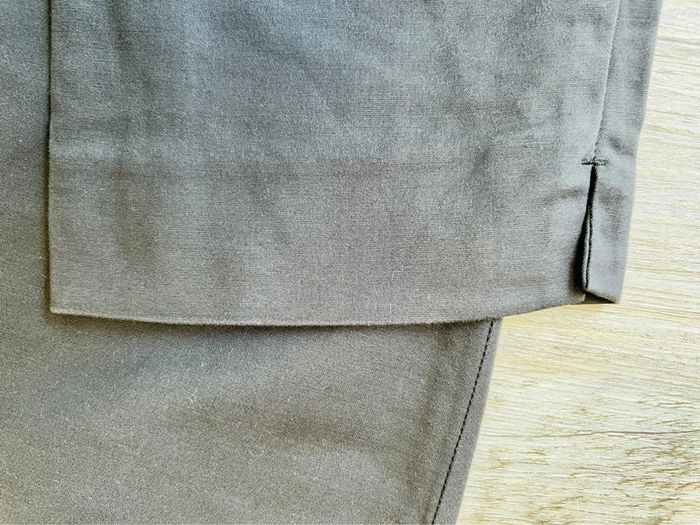 Pantalon femme gris, bas légèrement fendu en tissu léger.