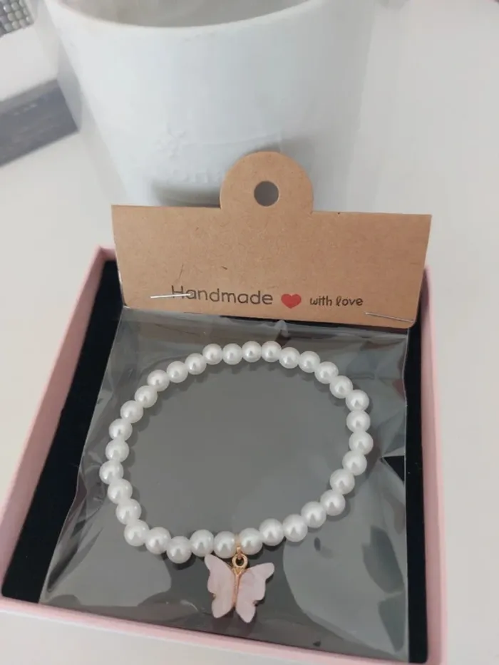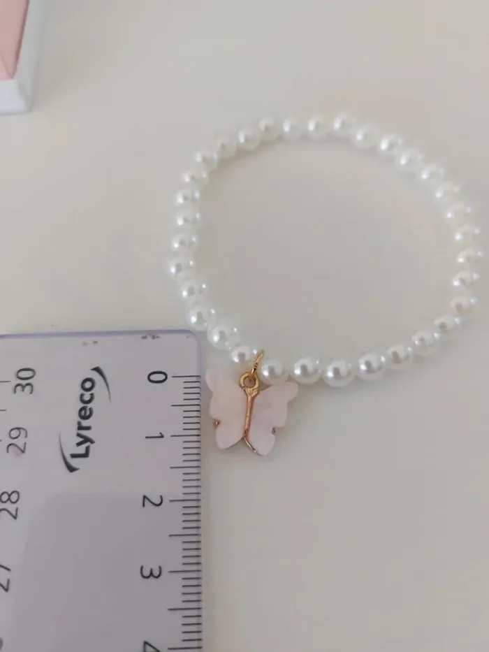 💥Pas d'envoi en Vinted Go Jolie bracelet fantaisie perles blanches et papillon rose. Tour de poignée 18 cm. Idéal pour offrir dans une pochette cadeau #anchik77bijoux #anchik77bracelet