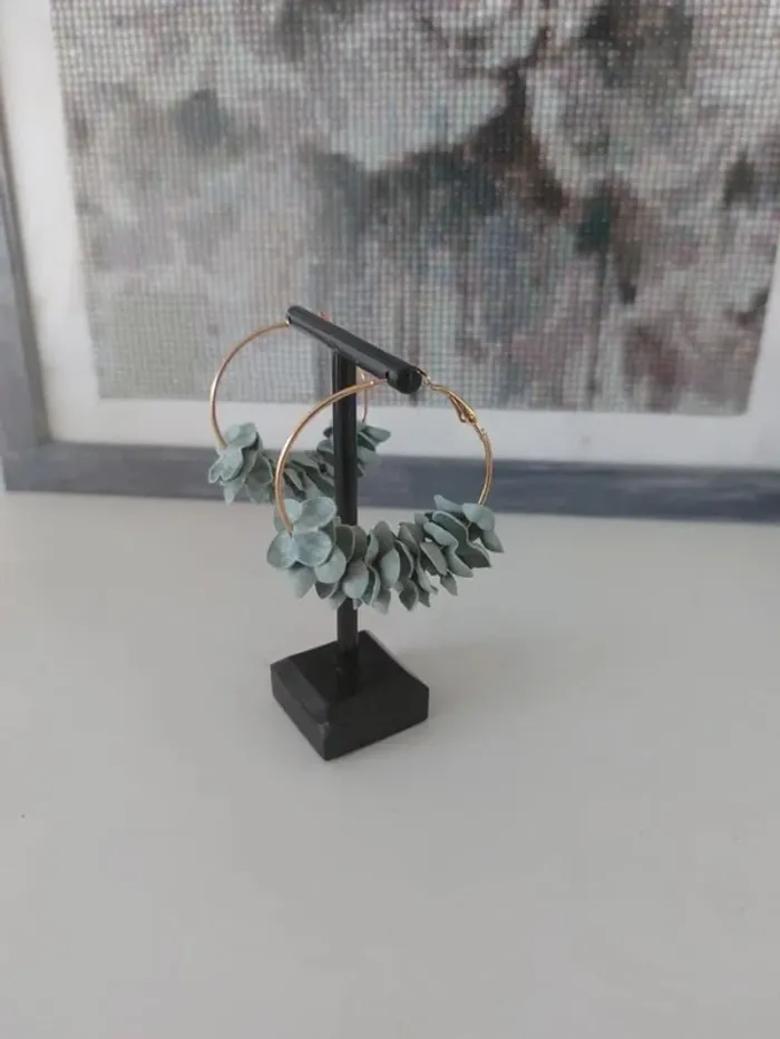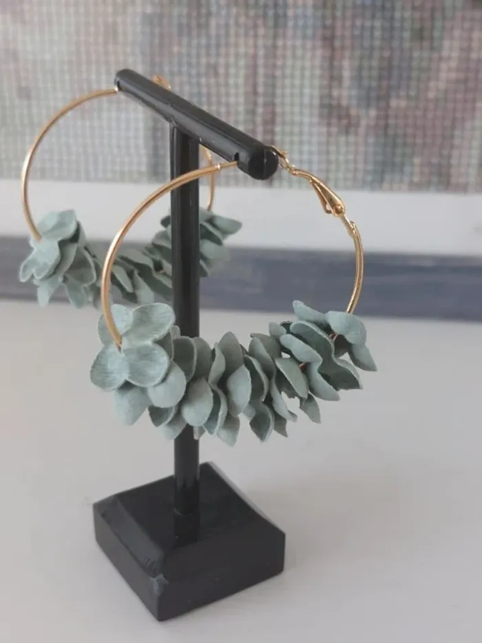 Boucles d'oreilles créoles fleurs tissu bleu ciel - photo numéro 2