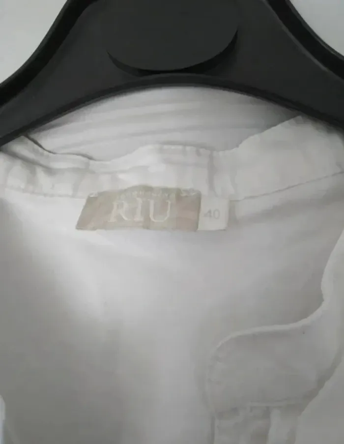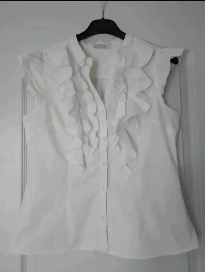 💥Pas d'envoi en Vinted Go Chemise sans manches très élégante avec les volants sur les épaules et devant. Qq légères traces sous les aisselles à peine visible (dernière photo).Marque Jacqueline Riu, taille 40. #anchik77femme #anchik77femme40