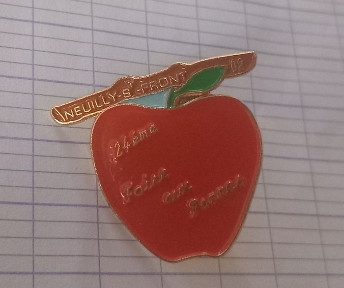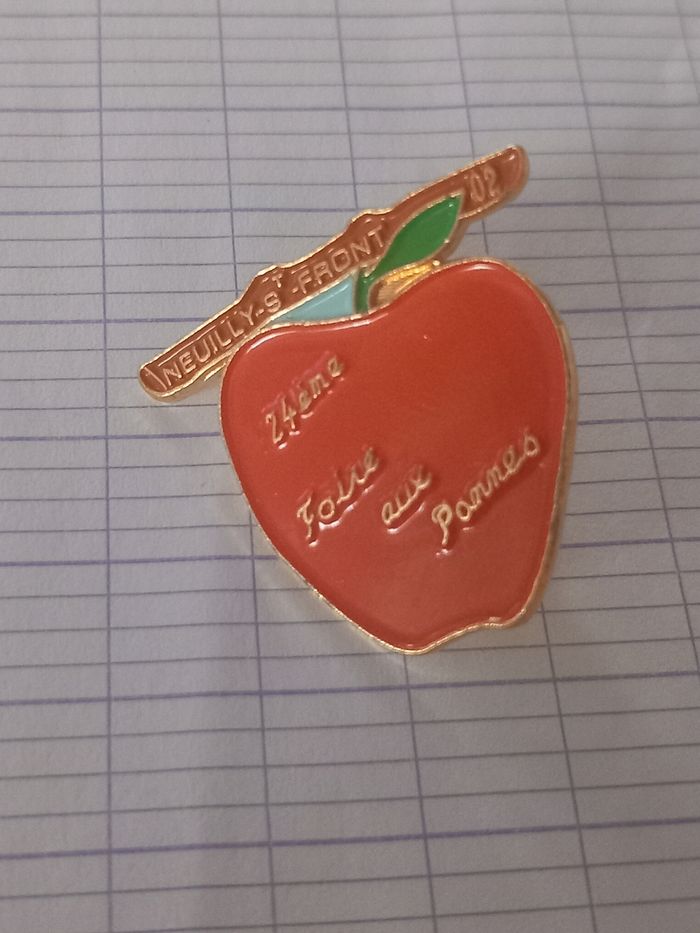Pin's Marqué Neuilly saint front : 24eme foire aux pommes Motifs pomme Matière métal En très bon état Dimensions approximative 2cm de long : 2,5cm de large