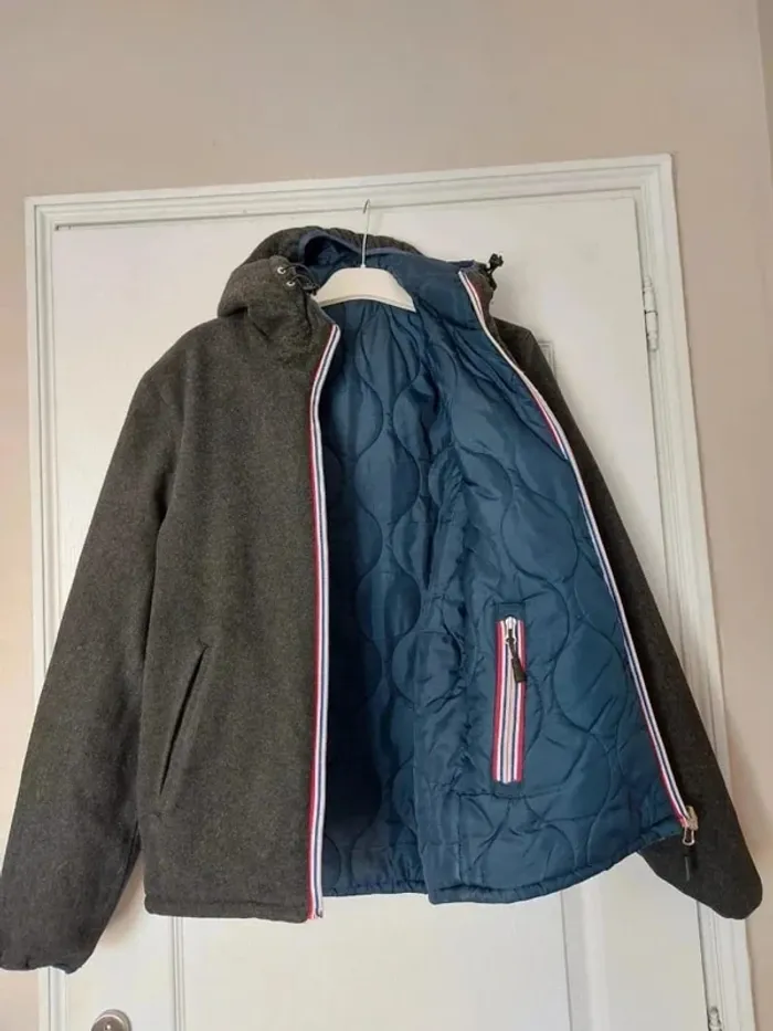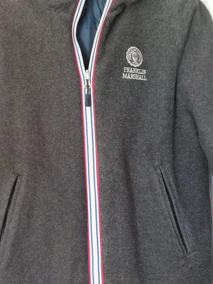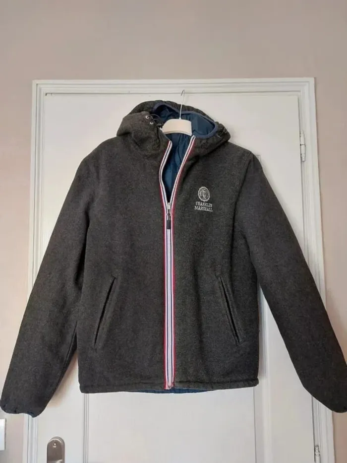 Veste réversible en laine, un coté doudoune et un coté chaude. Taille XS. Lavé. Un petit défaut au niveau de la fermeture éclair en bas visible sur la photo. Marque Franklin Marshall. Valeur 185€ #anchik77homme