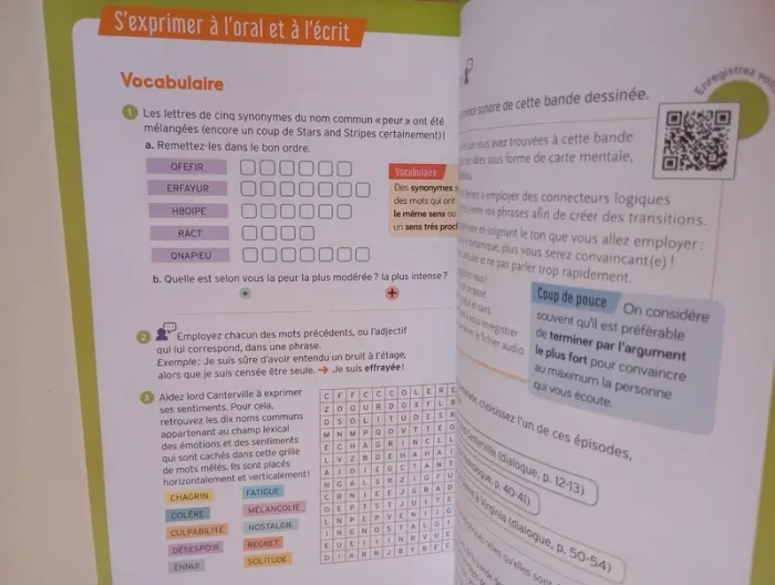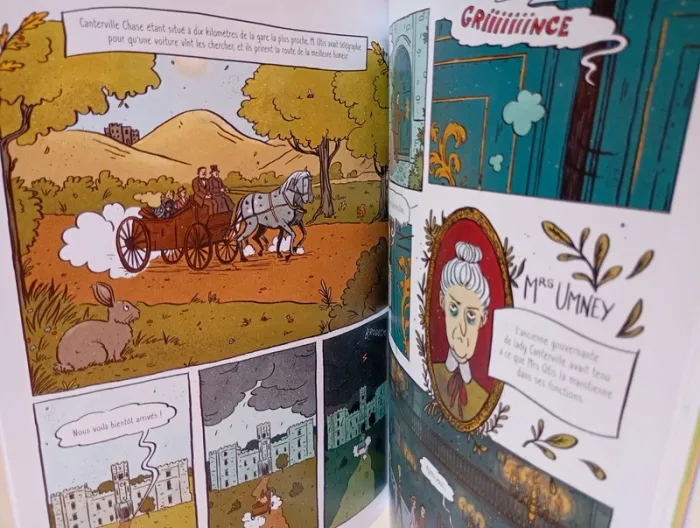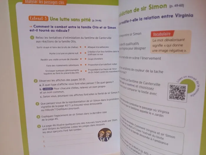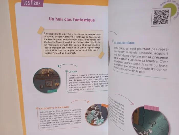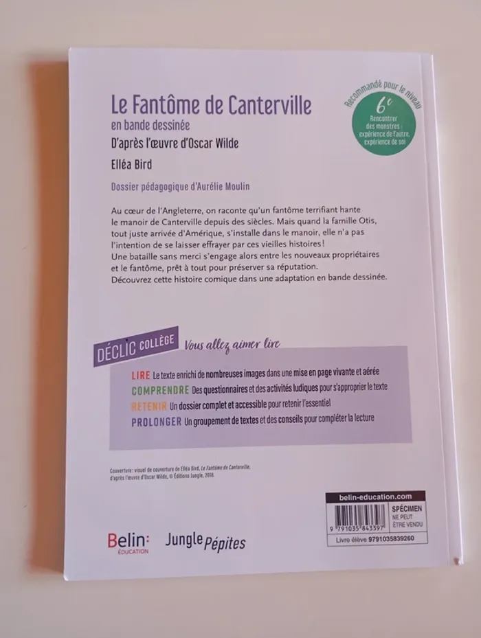 D'après l'oeuvre d'Oscar Wilde. Elléa Bird. Dossier pédagogique d'Aurélie Moulin. Au fin fond de l'Angleterre, la légende du fantôme qui hante le manoir de Canterville sème la terreur depuis des générations. Pourtant, la famille Otis, fraîchement débarquée d'Amérique, y pose ses valises et compte bien ne pas se laisser berner par ces croyances ridicules ! Une bataille sans pitié s'engage alors entre les nouveaux propriétaires et le fantôme, prêt à tout pour conserver sa réputation. Parcourez cette aventure comique, mise en images dans une adaptation en bande dessinée à destination des élèves de 6e. LIRE Le texte adapté en bande dessinée. COMPRENDRE Des questionnaires et des activités ludiques pour s'approprier le texte. RETENIR Un dossier complet et accessible pour retenir l'essentiel. PROLONGER Un groupement de textes et des conseils pour compléter la lecture. + ACCOMPAGNER De nombreux compléments numériques pour aider les élèves dans la lecture. Éditeur ‏ : ‎ BELIN EDUCATION 95 pages Dimensions ‏ : ‎ 16 x 1.1 x 22 cm Livre en excellent état Je vends d'autres livres de la même collection #phil_peg_déclic #fantomedecanterville #dossierpédagogique #6e #collège #français