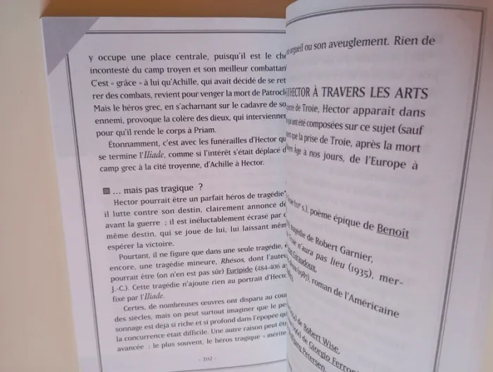 Alors que troyens et grecs s'affrontent sans répit, Hector, fils du Roi Priam, se retrouve face à Achille, redoutable adversaire. Au cours de cette guerre sanglante et meurtrière, Hector tue, en effet, un jour, sans le savoir, Patrocle, le fidèle compagnon d'Achille. Ce dernier fou de douleur et de rage, promet de venger son ami dans un ultime et dernier combat contre le jeune prince troyen. Éditeur ‏ : ‎ Nathan 128 pages Âge de lecture ‏ : ‎ 9 - 12 ans Dimensions ‏ : ‎ 13.2 x 1.2 x 19.1 cm Livre en excellent état Je vends d'autres livres sur la mythologie #phil_peg_mythologie #mythologie #troie #hector #bouclier