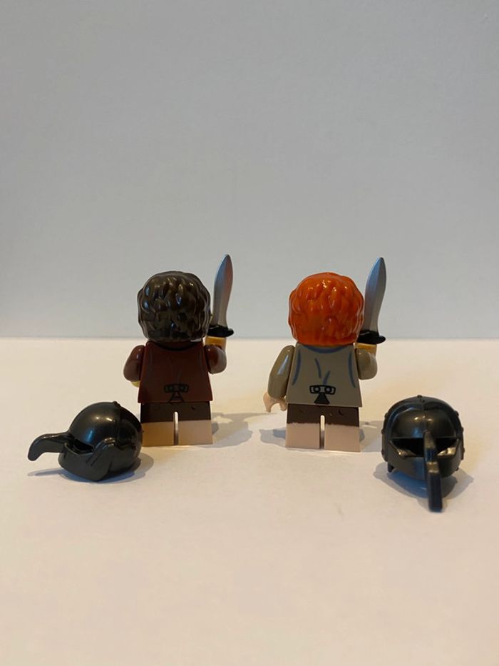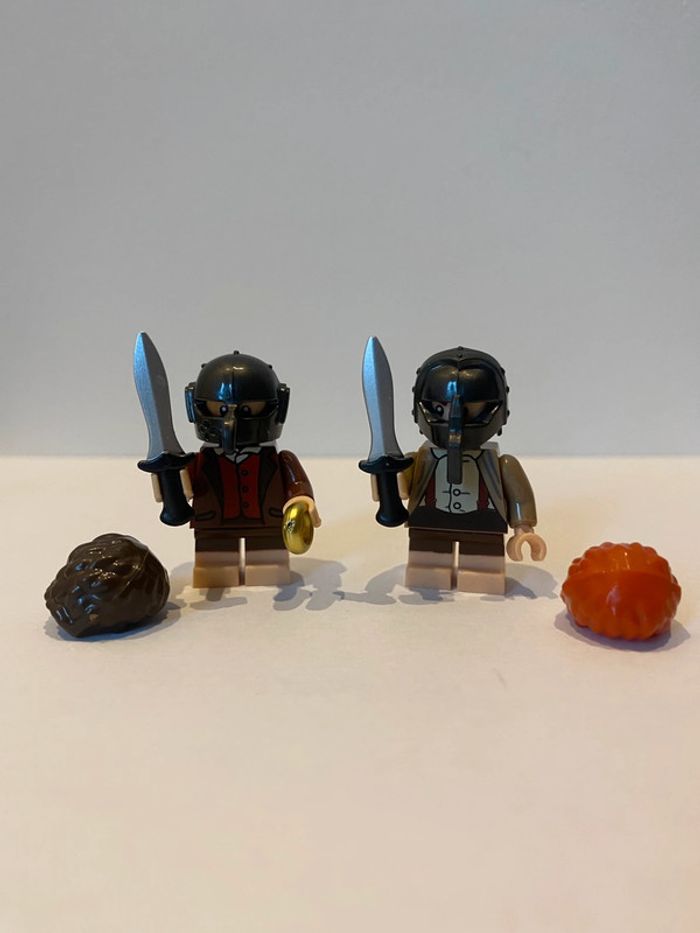 Figurine type lego Frodon et Sam avec les casques d’orcs. le seigneur des anneaux