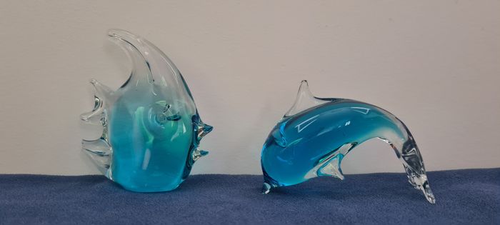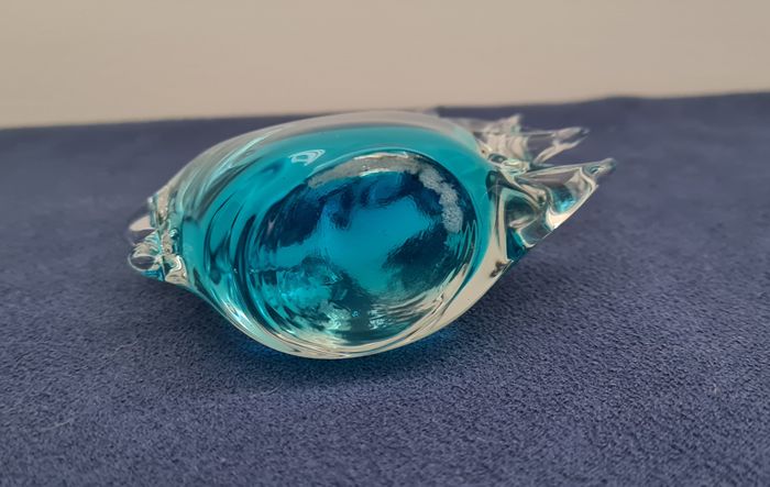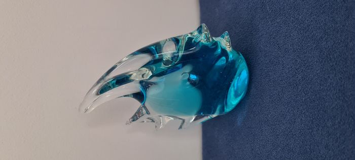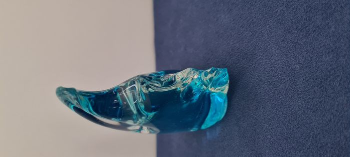 Poisson en verre bleu dégradé, style poisson ange. Déco, presse-papier,.. Vu pendant des années dans une vitrine chez mamie. La nageoire caudale est abimée, il manque un petit morceau. Ne se remarque pas au premier coup d'œil, j'ai constaté ce défaut au toucher, car la terminaison est moins lisse. Dim : hauteur 10.5 cm, largeur 9 cm. La face plate sur laquelle le poisson se pose mesure 3.5 x 4 cm. Poids 245 gr. Autre pièce assortie sous forme de dauphin en vente dans mon dressing. Hormis le défaut signalé ci dessus, le poisson est en très bon état. #poissondéco #poissonverrebleu #verrebleudégradé #pressepapier #mar-taydéco #mar-taymaison