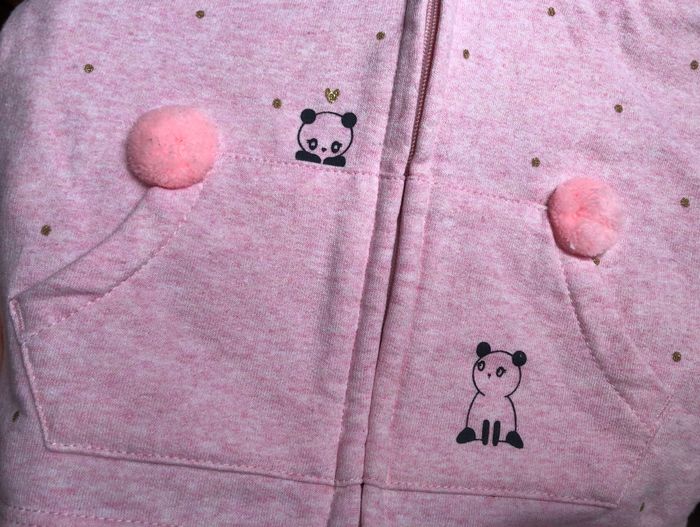 Sweat/ gilet zippé Kiabi, Taille 9 mois/ 69-72 cm, MI-saison/ hiver, En coton molletonné, Capuche doublée. Chiné rose et blanc, moucheté orange et gris (mais c’est discret). Petits points et mini cœurs dorés. Illustrations de petits chats sur l’avant. 2 pompons au dessus des poches. Oreilles sur la capuche. En très bon état, pas de trou ni de tache. Fermeture ok. 🌸 Vous aimez cet article ? N’oubliez pas de visiter le reste de mon dressing en filtrant les tailles.