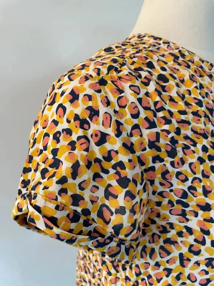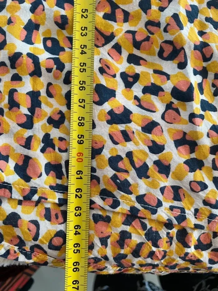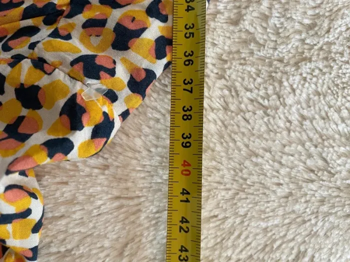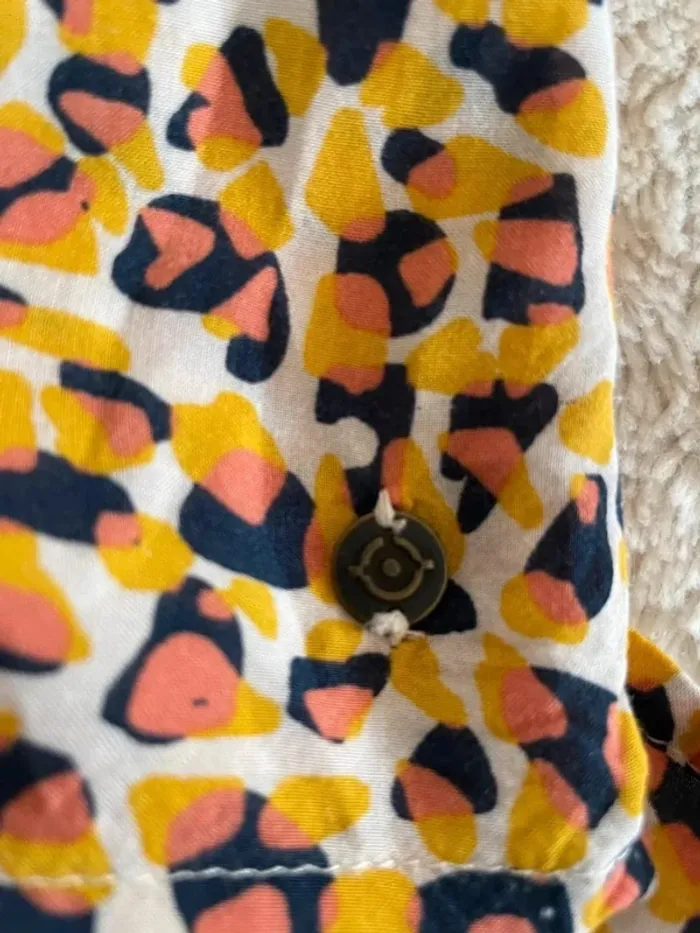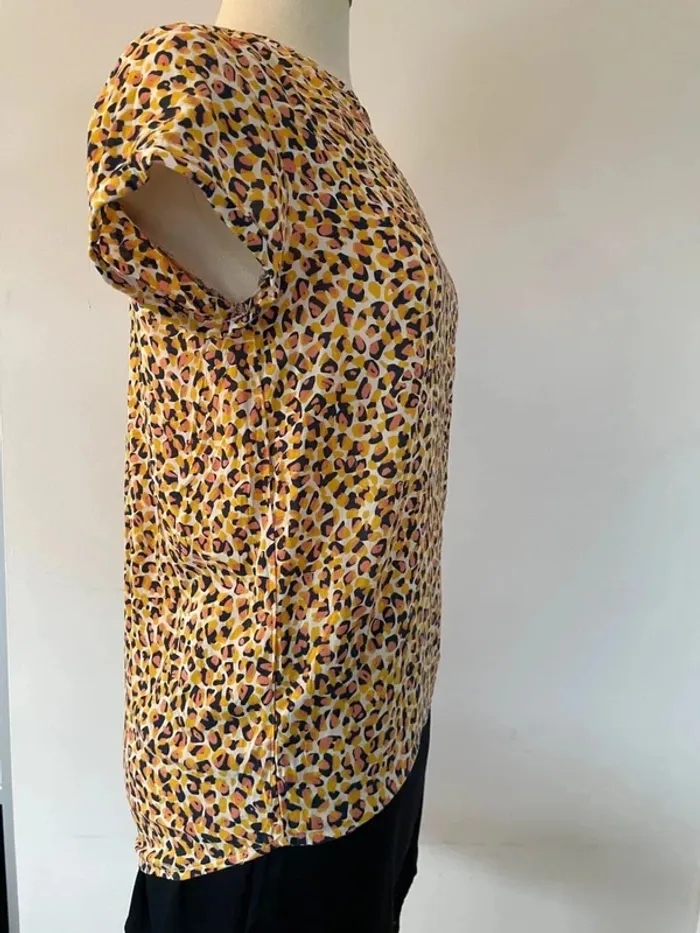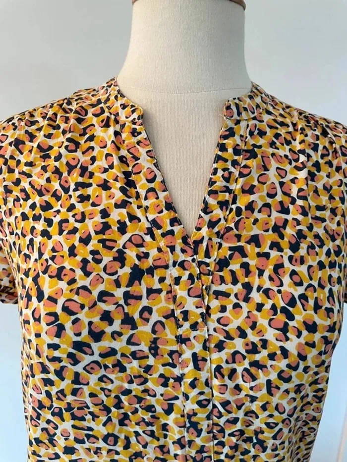 Superbe blouse manches épaules et col V sympa. Cette blouse façon chemisier vous séduira avec son motif chiné dans les jaunes saumon et noir. 📕 Marque Bonobo : Taille S étiquette entretien coupée. Très bon état mais à signaler un accroc au tissu sur 1cm environ qui pourra être recousu (cf. Photo) Largeur épaule : 39cm Longueur : 66cm