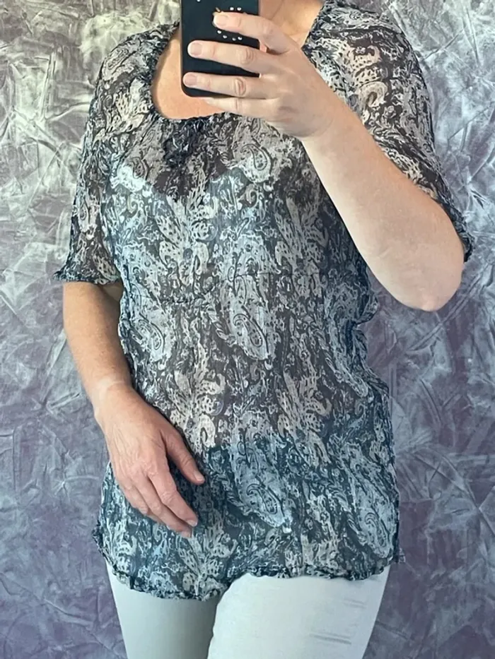 Sublime blouse longue Marina Sport (Marina Rinaldi), manches 3/4. Motif discret et élégant dans les tons bleus, parfait pour un look chic et décontracté. • Matière : 100% soie – fluide, légère, très agréable à porter • Transparence subtile : juste ce qu’il faut pour un effet séduisant sans en faire trop • Taille indiquée : 27, équivalent d’un 40 FR Coupe confortable et flatteuse, parfaite avec un pantalon blanc ou un jean. État : Parfait, portée une seule fois. Prix boutique élevé – ici à prix doux pour lui offrir une seconde vie. Envoi rapide et soigné ! #MarinaRinaldi #MarinaSport #blousesoyeuse #hautdescreateurs #secondevie #slowfashion #blousechic #silkblouse #modegrandeclasse #VintedFrance #nojolilifemme #nojolilifemmemp #nojolilifemme40