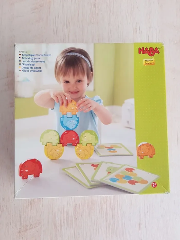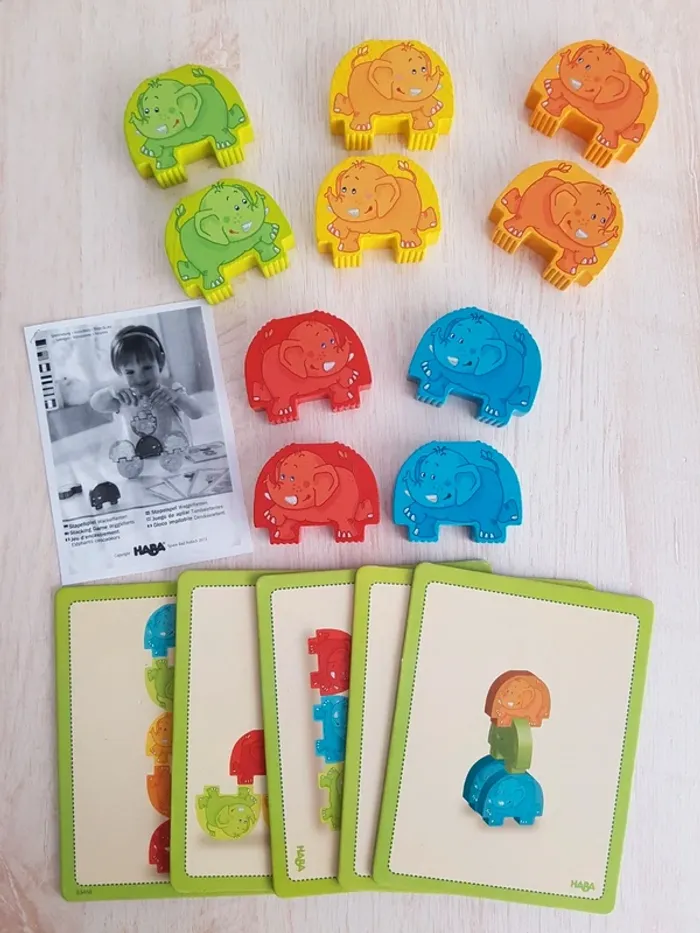 Jeu d'encastrement Éléphants cascadeurs de Haba avec des grosses pièces en bois faciles à manipuler pour construire en équilibre. Jeu de construction dans l'espace et de manipulation où les animaux sont empilés pour former des pyramides en 3 dimensions (construction verticale). Les cartes proposent 10 modèles de différentes difficultés Il faut choisir la bonne pièce, la placer à la bonne place et dans l'ordre imposé par le modèle (les éléments du bas en premier). Possibilité de les poser au sol horizontalement en suivant l'exemple ou selon son imagination. Un jeu éducatif montessori pour encourager la motricité fine, la notion de tri, d'équilibre et d'organisation spatiale. COMPLET : 10 pièces éléphant, 5 cartes modèles recto-versoet 1 règle du jeu imprimée Dimensions des pièces : 7 × 5,5 cm