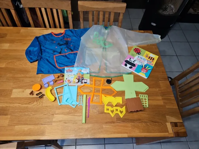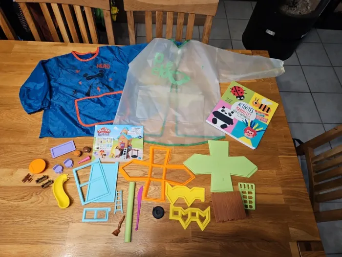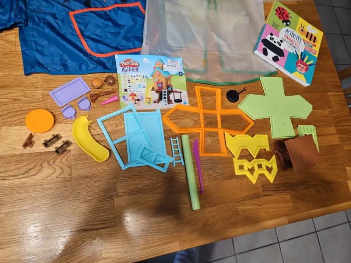 - 1 jeu de pâte à modeler avec différents accessoires pour construire un petite maison (play-Doh Builder) complet.