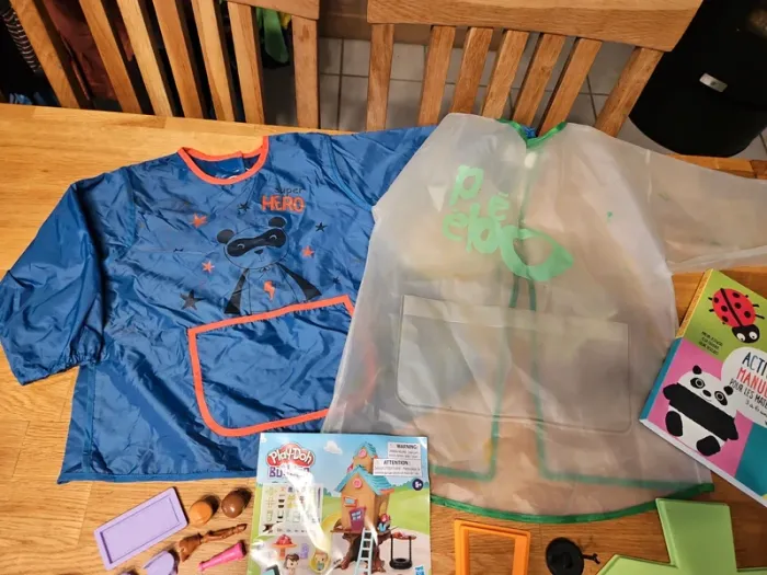 - 2 tabliers en bon état général (plus d'étiquettes mais correspond a un enfant de 2 ans à environ 5 ans)