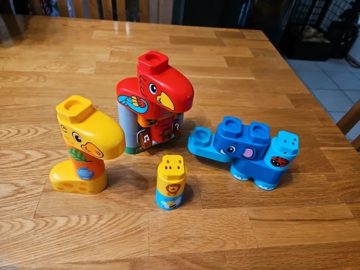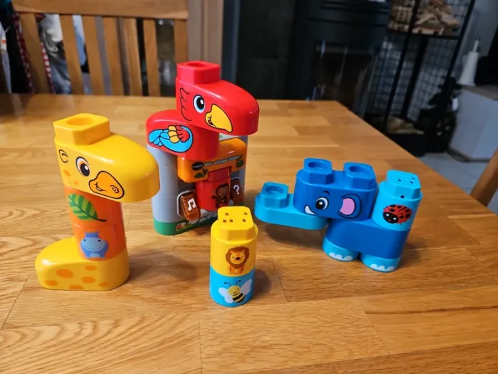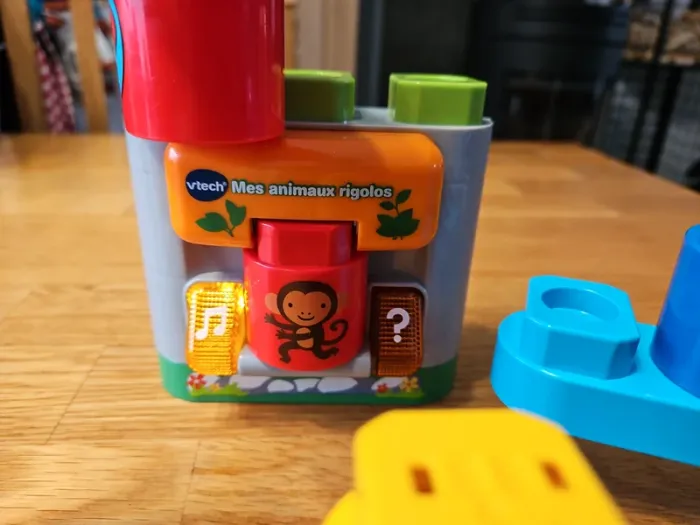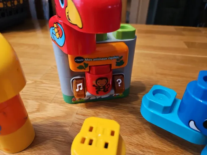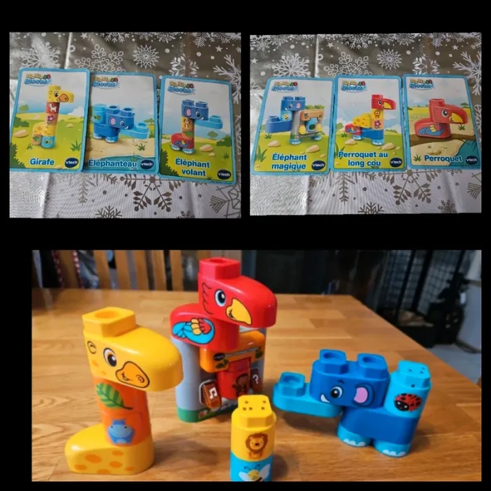 Bla-Bla-Blocks, c’est un système de construction avec des blocs interactifs adaptés aux tout-petits. Avec Mes animaux rigolos, l’enfant découvre 16 blocs illustrés et colorés à connecter pour faire de super créations sur le thème des animaux de la jungle. La base électronique parlante reconnaît les blocs interactifs et réagit en fonction : elle donne leur couleur, le nom du dessin correspondant, différentes anecdotes…Un bouton Découvertes permet de déclencher des chansons et des mélodies et d’encourager l’enfant à réaliser des constructions.L’enfant laisse libre cours à son imagination et peut assembler à l’infini grâce à la multitude de combinaisons possibles. Il développe sa motricité fine en manipulant les blocs.Apprentissage des premiers chiffres, des animaux et des aliments. Des formes originales et des sets compatibles les uns avec les autres.