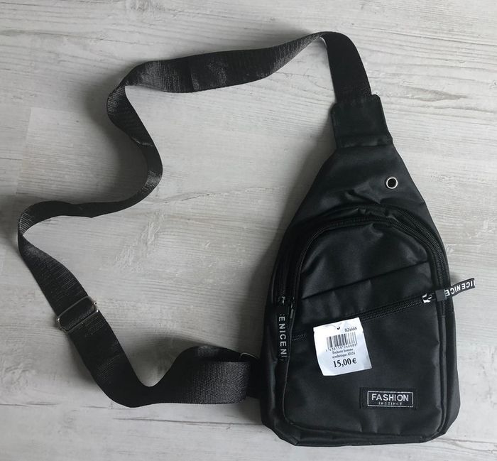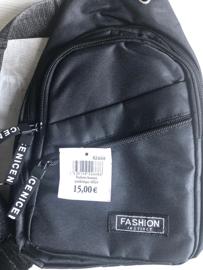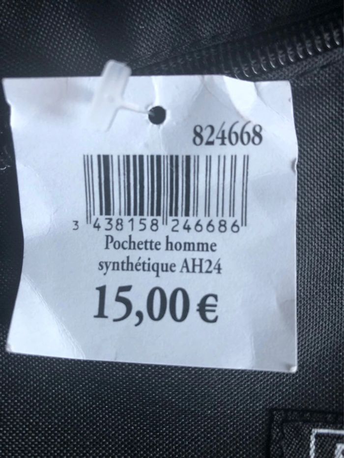 Bonjour #videdressing85rienqueduneuf #videdressing85sacsetsacsados NEUVE avec étiquette Pochette homme noire A bandoulière réglable 4 poches extérieures -3 zippées -1 non zippée 1 pochette zippée intérieure 1 œillet métallique pour passage d’un fil téléphone ou autre, Dimensions: Hauteur: 30 cm Largeur: 18 cm Épaisseur maxi: 12 cm Cdt