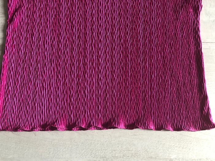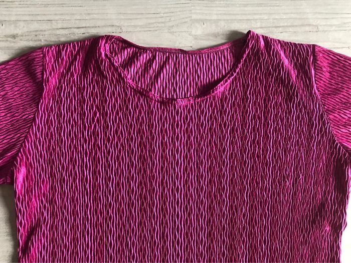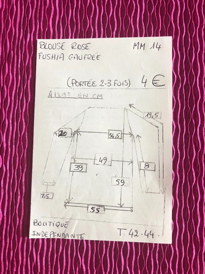Bonjour #videdressing85vêtfemmeXL42 #videdressing85vêtfemmeXLXXL4244 #videdressing85vêtfemmeXXL44 Comme NEUVE, portée 2-3 fois T 42-44, très extensible Dimensions à plat sur la dernière photo Blouse rose fuchsia Gaufrage fantaisie en forme de vague qui rend le tissus très, très extensible Encolure ronde Manches courtes Cdt