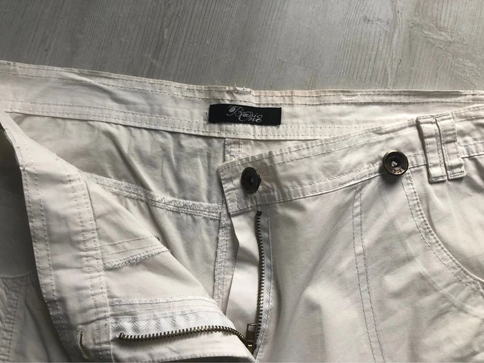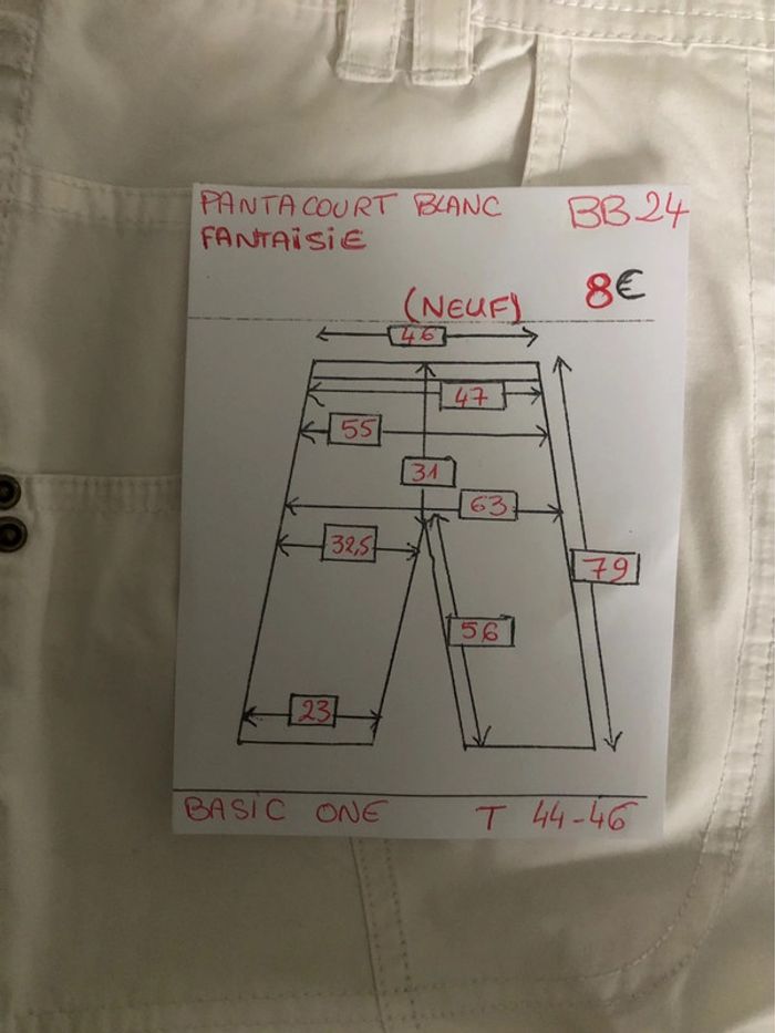 Bonjour #videdressing85rienqueduneuf #videdressing85vêtfemmeXXL44 #videdressing85vêtfemmeXXL3XL4446 #videdressing85vêtfemmeXL46 NEUF, sans étiquette T 44-46 Dimensions sur la dernière photo Pantacourt blanc 3 poches devant 2 poches arrière 1 poche cuisse avec zip Taille avec passants ceinture Fermeture par zip et boutons métalliques Pattes de boutonnage en bas avec 2 pressions métalliques Coutures fantaisies devant et derrière Marque: Basic one Cdt