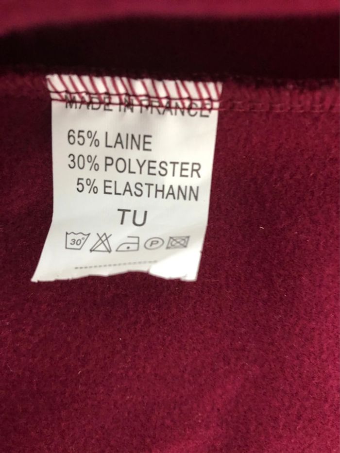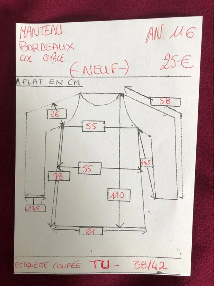 Bonjour #videdressing85rienqueduneuf #videdressing85Tunique #vintedgift #videdressig85vêtfemmeM38 #videdressing85vêtfemmeML3840 #videdressing85vêtfemmeL40 #videdressing85vêtfemmeLXL4042 #videdressing85vêtfemmeXL42 NEUF, étiquette coupée T unique, correspond du 38 au 42 Dimensions sur la dernière photo Manteau Bordeaux Très chaud 65% laine 30% polyester 5% élasthane Grand col châle 2 poches devant en biais Devant style portefeuille arrondi Passants et ceinture Forme droite Touché très doux Cdlt
