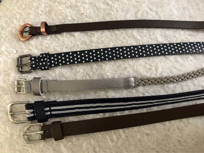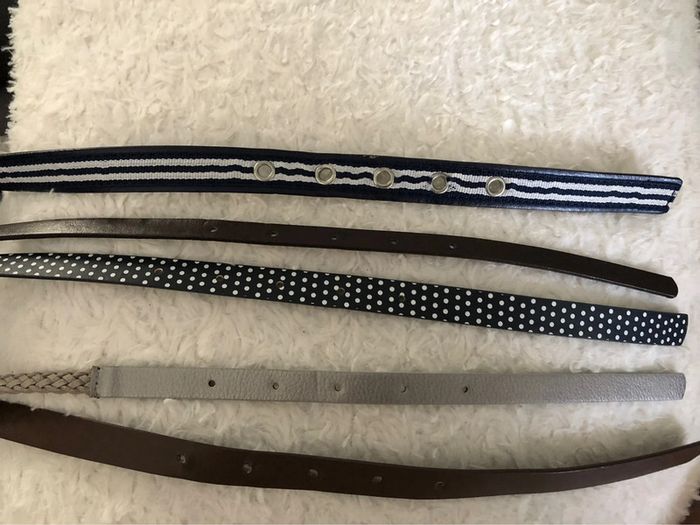 Bonjour #videdressing85ceinturesetceinturons #videdressing85vintage Portées 1 ou 2 fois chacune Très bon état Longueur: 110cm Largeur: 1,5 à 2,5cm Lot de 5 différentes ceintures Tressée, à pois, rayée, unie noire, unie marron Boucles métalliques Cdlt
