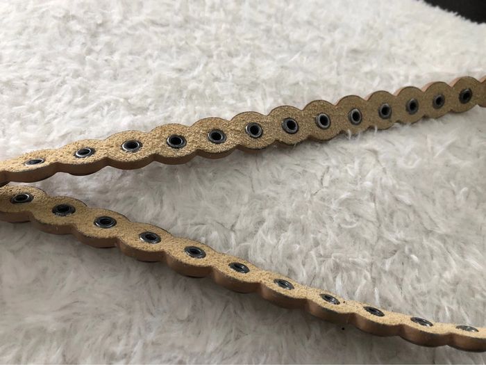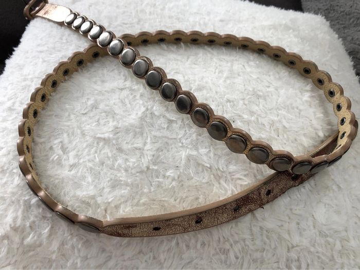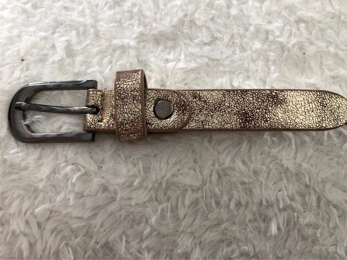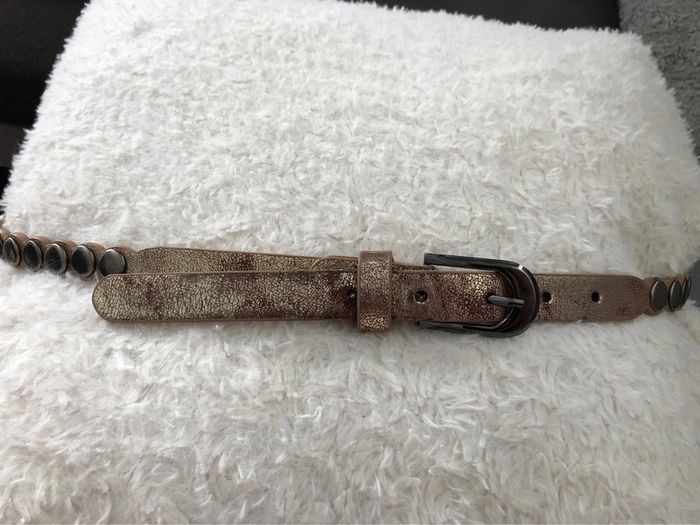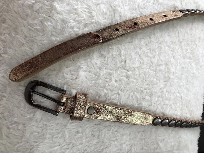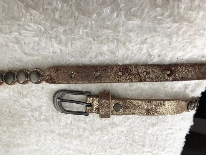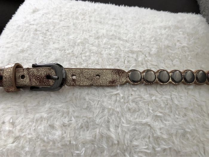 Bonjour #videdressing85ceinturesetceinturons Ceinture dorée vieilli Longueur: 95cm Largeur: 2 cm Boucles et clous métal gris anthracite Boucle vissée Cdlt