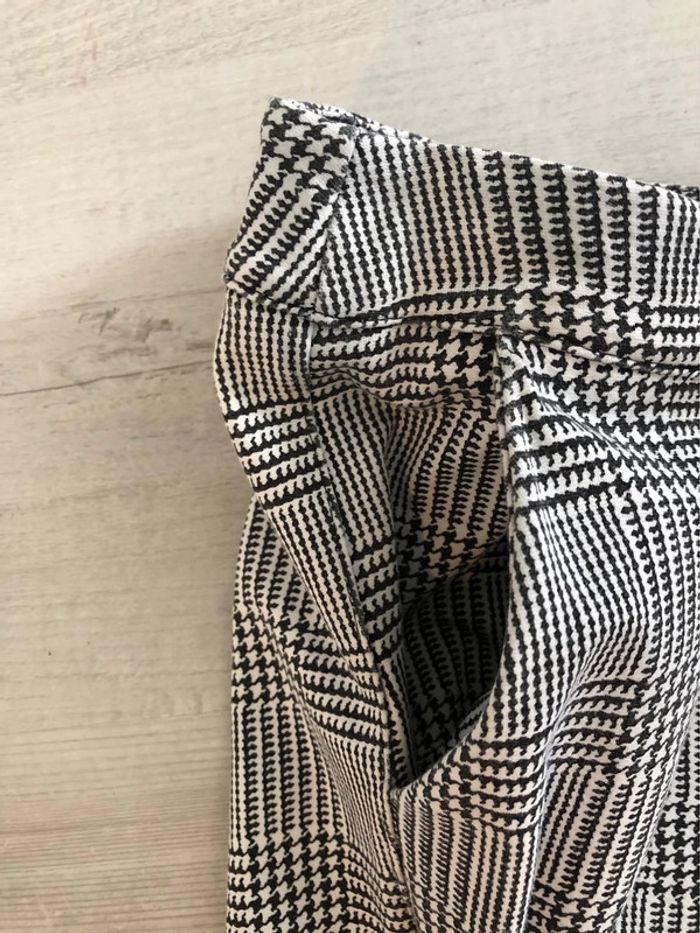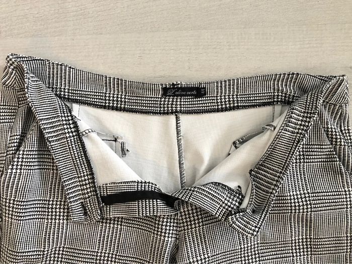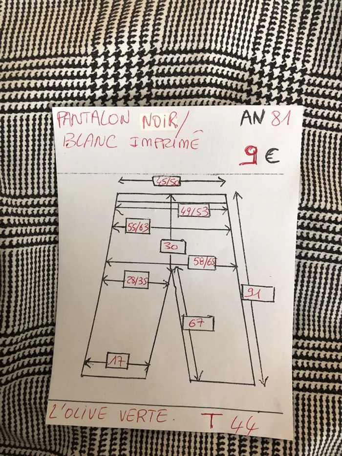 Bonjour #videdressing85vêtfemmeXXL44 Peu porté, très bon état Dimensions sur la dernière photo T44 très extensible Pantalon imprimé noir/blanc Forme droite 2 poches devant Passants pour ceinture Zip et bouton 2 fausses poches à l’arrière Intérieur blanc Cdlt