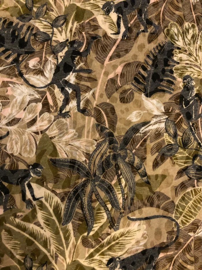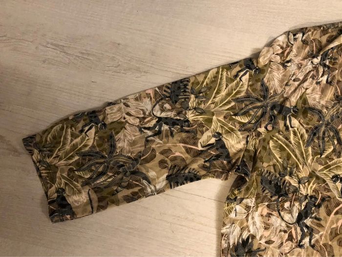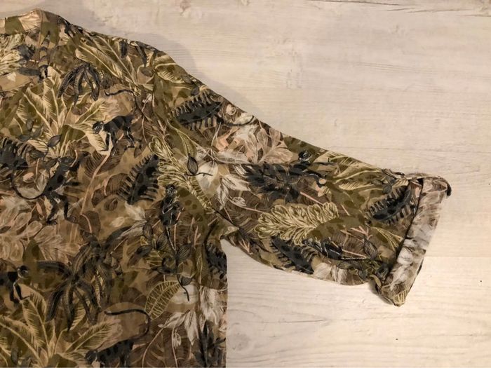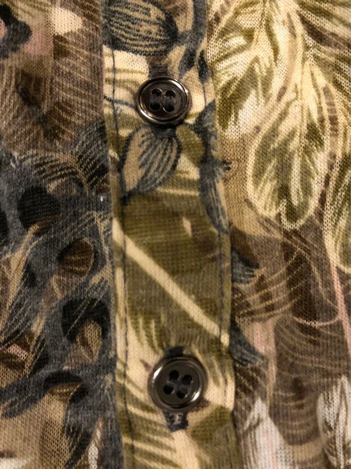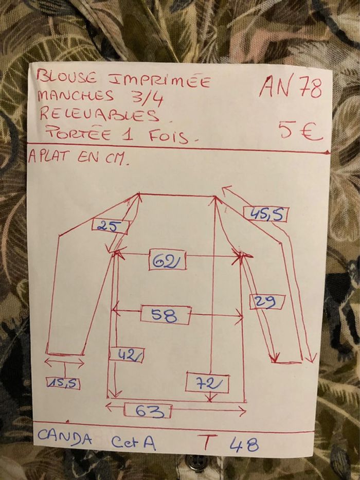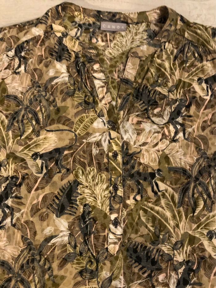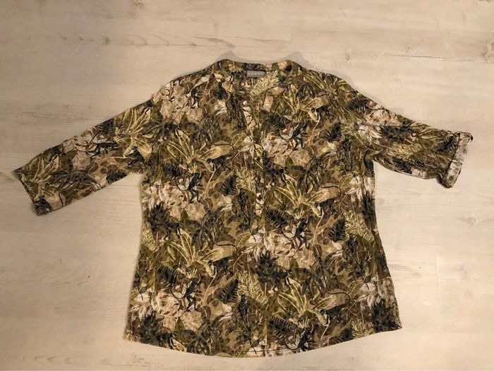 Bonjour #videdressing85vêtfemme4XL48 Portée 1 fois, très bon état Dimensions sur la dernière photo T 48, extensible Blouse imprimée sur fond « taupe » Kaki, beige, gris Encolure en V avec bande de 4 boutons métal Manches 3/4 relavables par patte et bouton Fronces omoplates Pinces poitrine Cdlt