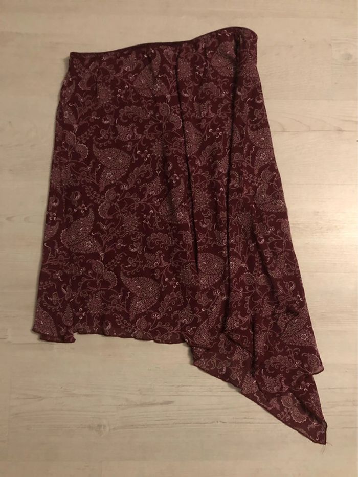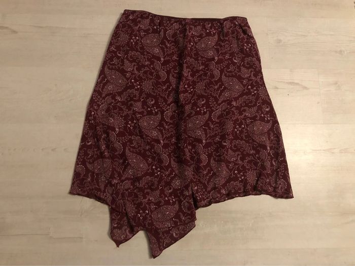 AN122- Jupe imprimée asymétrique « somewhere » Bordeaux à motifs T 46-48 - photo numéro 5