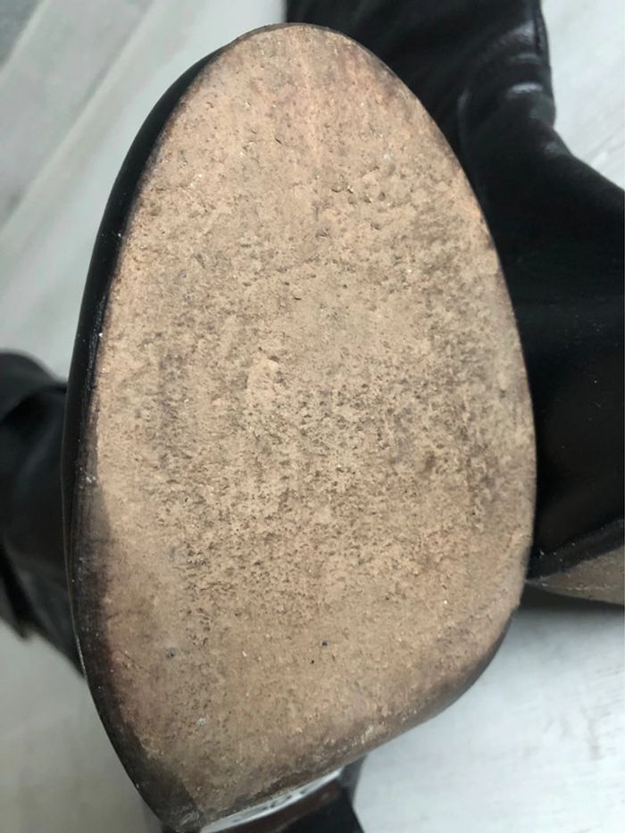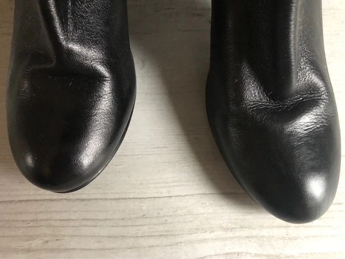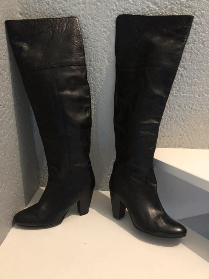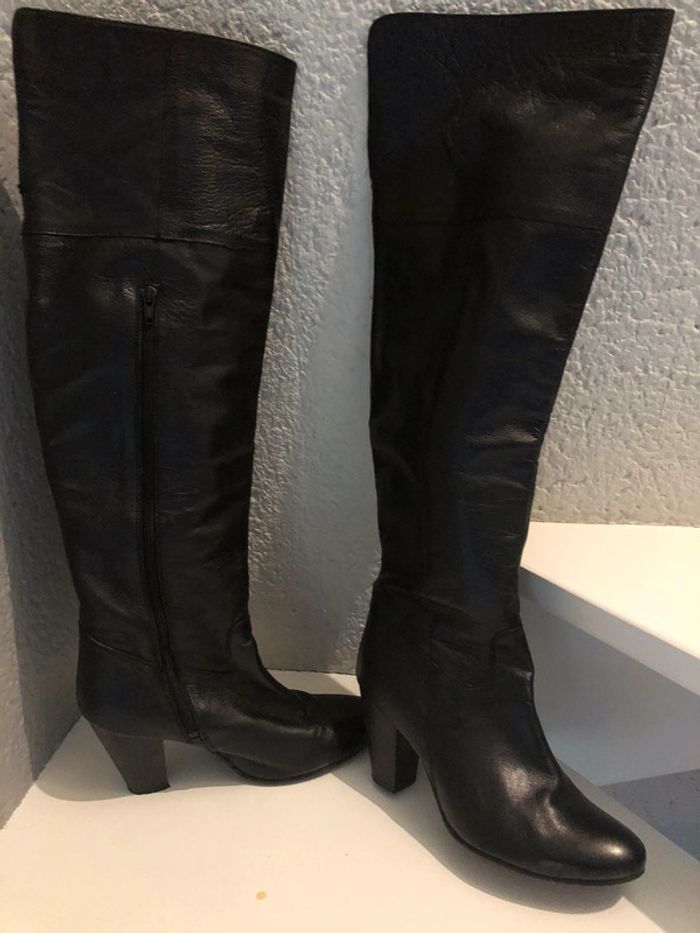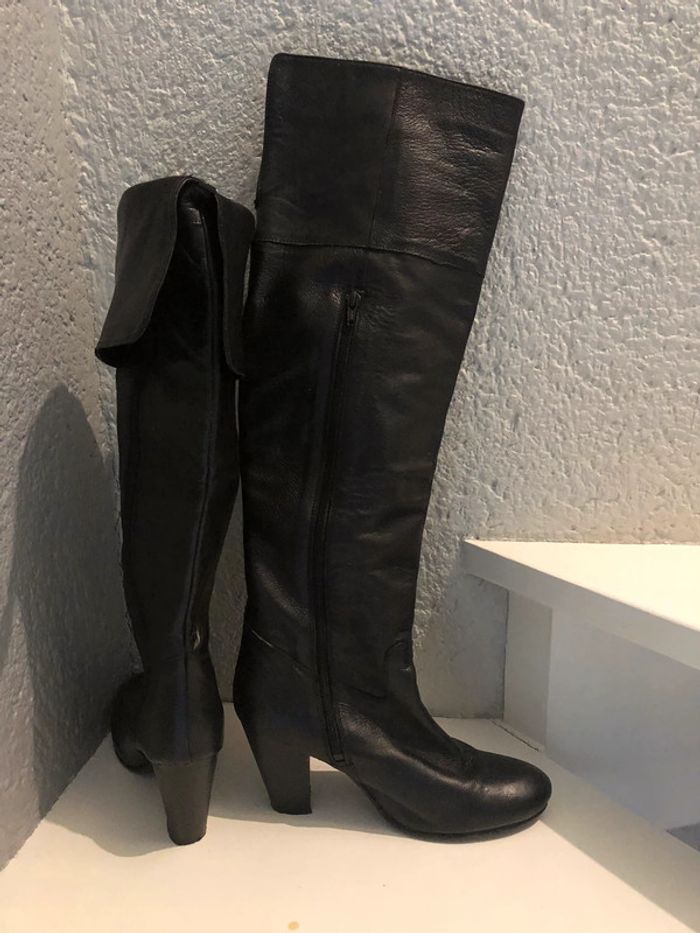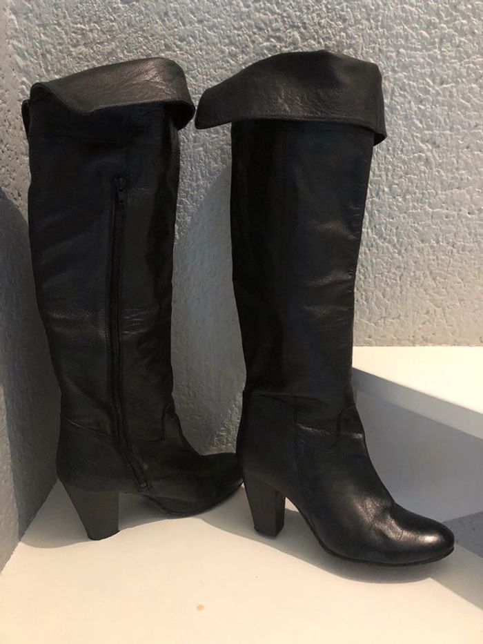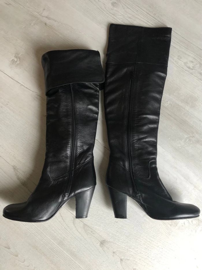 bonjour #videdressing85chaussfemme40 #vintedgift Portées 2 fois, aucunes rayures, comme neuve P40 Bottes hautes / cuissardes qui arrivent bien au dessus du genou Elles peuvent se rabattent pour arriver sous le genou bottes très class Elles sont tout en cuir (pied, tige, semelle, intérieur et extérieur) Zip intérieur Talons: 8,5cm Valeur d’achat: 165€ Dimensions sur la dernière photo Cdlt