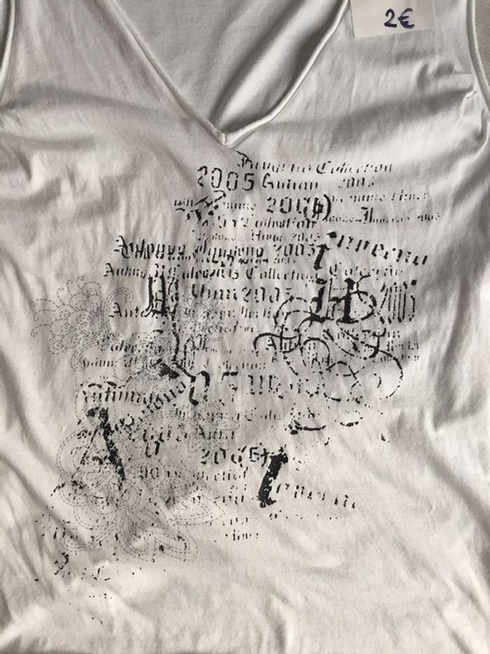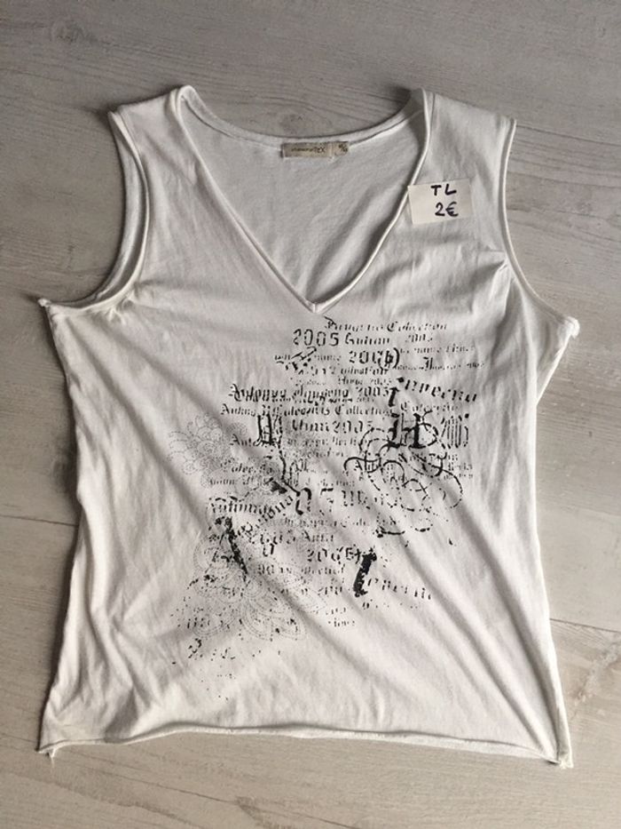#videdressing85vêtfemmeL40 #videdressing85vêtfemmeLXL4042 #videdressing85vêtfemmeXL42 #videdressing85vintage bonjour tee-shirt sans manches blanc imprimé noir porté 1 fois étiqueté T 46/48 mais taille petit pour du 40/42 - L/XL état neuf pinces poitrine ME DEMANDER : envoi possible par transporteur ou courrier suivi en France: 2,70€ cdlt