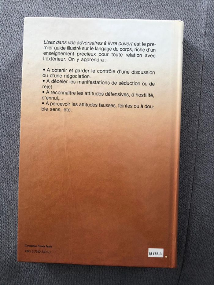 bonjour #videdressing85livrepsychologie #videdressing85livreadultes #videdressing85livreados TBE juste des traces d’humidité jaunâtre sur la couverture à l’intérieur lisez dans vos adversaires à livre ouvert Gérard Nierenberg / Henry Calero cdlt
