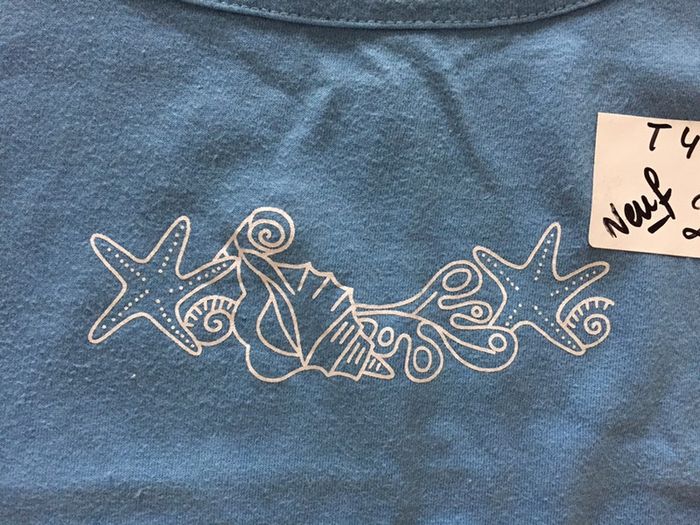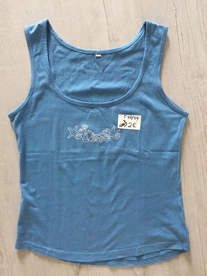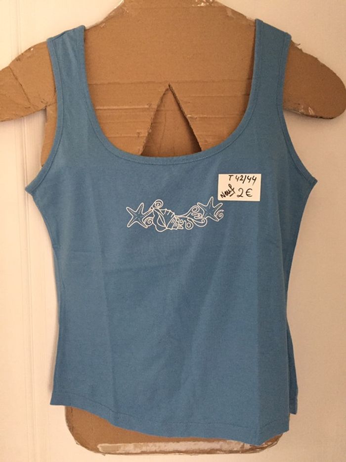 #videdressing85vêtfemmeL40 #videdressing85vêtfemmeLXL4042 #videdressing85vêtfemmeXL42 #videdressing85vintage #videdressing85rienqueduneuf #vintedgift bonjour NEUF débardeur bleu étiqueté T 42/44 mais taille 40/42 - L/XL il est neuf grand col rond imprimé coquillages devant cdlt