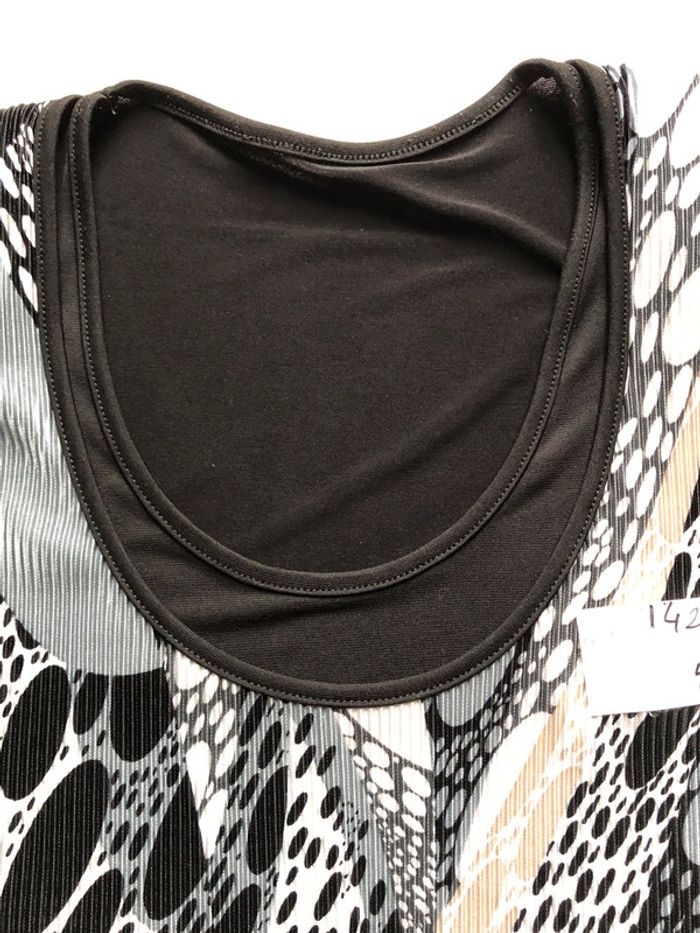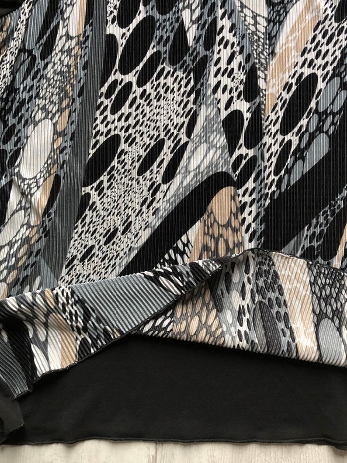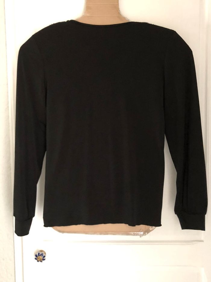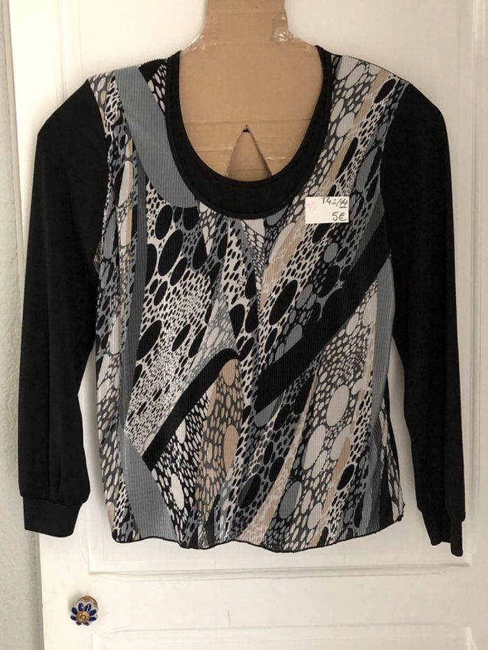 #videdressing85vêtfemmeXL42 #videdressing85vêtfemmeXLXXL4244 #videdressing85vêtfemmeXXL44 bonjour état neuf, porté 1 soirée haut noir manches longues T 42/44, XL/XXL (taille grand) tissus devant plissé et imprimé encolure ronde et devant doublé cdlt