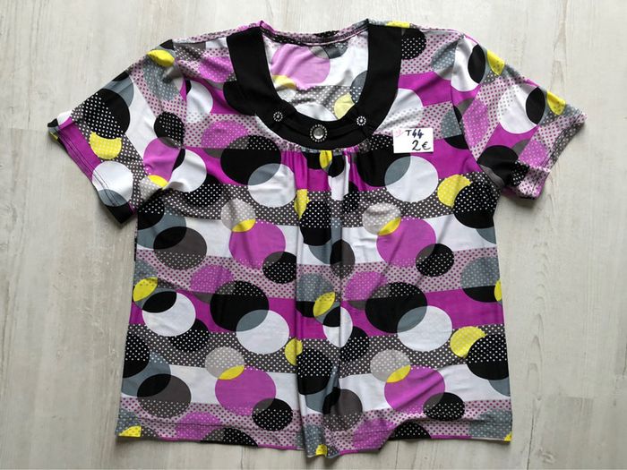 #videdressing85vêtfemmeXL42 #videdressing85vêtfemmeXLXXL4244 #videdressing85vêtfemmeXXL44 bonjour blouse imprimée T 42/44. XL/XXL me demander les mesures au cas où strass à l’encolure un peu râpée sur le devant mais ne se voit pas beaucoup, ça tombe dans les plis (photo 5) cdlt