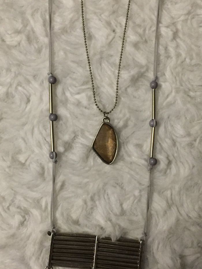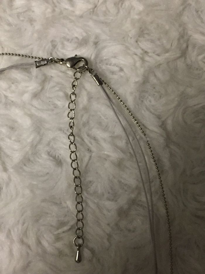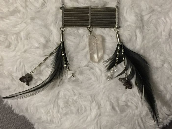 #videdressing85bijouxxx #videdressing85rienqueduneuf #vintedgift bonjour NEUF collier fantaisie sur lacet gris clair très fin, chaînette avec pendentif plaque métal avec plumes noires, quartz blanc, chaînettes avec pierres blanches et pierres noires réglable en longueur acheté: 15€ vendu: 7,50€ cdlt